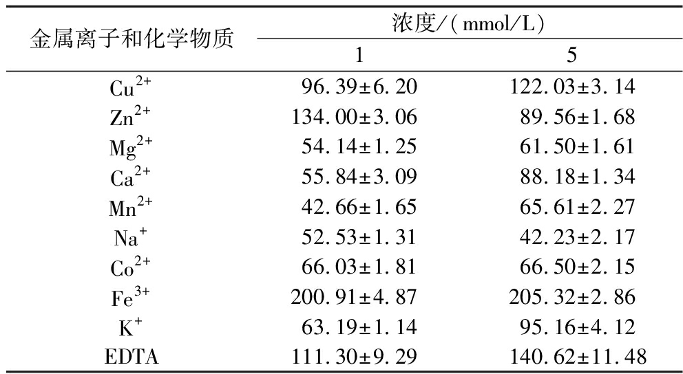 测定浓度为1、5 mmol/L金属阳离子(Cu2+、Zn2+、Mg2+、Ca2+、Mn2+、Na+、Co2+、Fe3+和K+)和化学物质乙二胺四乙酸(ethylenediaminetetraacetic acid,EDTA)对酶活力的影响。将纯化后的酶液与各种金属离子及化合物在40 ℃下孵育15 min,然后在最适反应条件下测定酶活力。以未添加金属离子的催化活力为对照,其活力定义为100%。