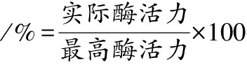 为测定重组酶的pH稳定性,将纯化后的酶液分别置于上述不同pH值的缓冲液中,于4 ℃冷藏处理24 h后,在最适反应条件下测定酶活力,使用公式(2)计算相对酶活力。