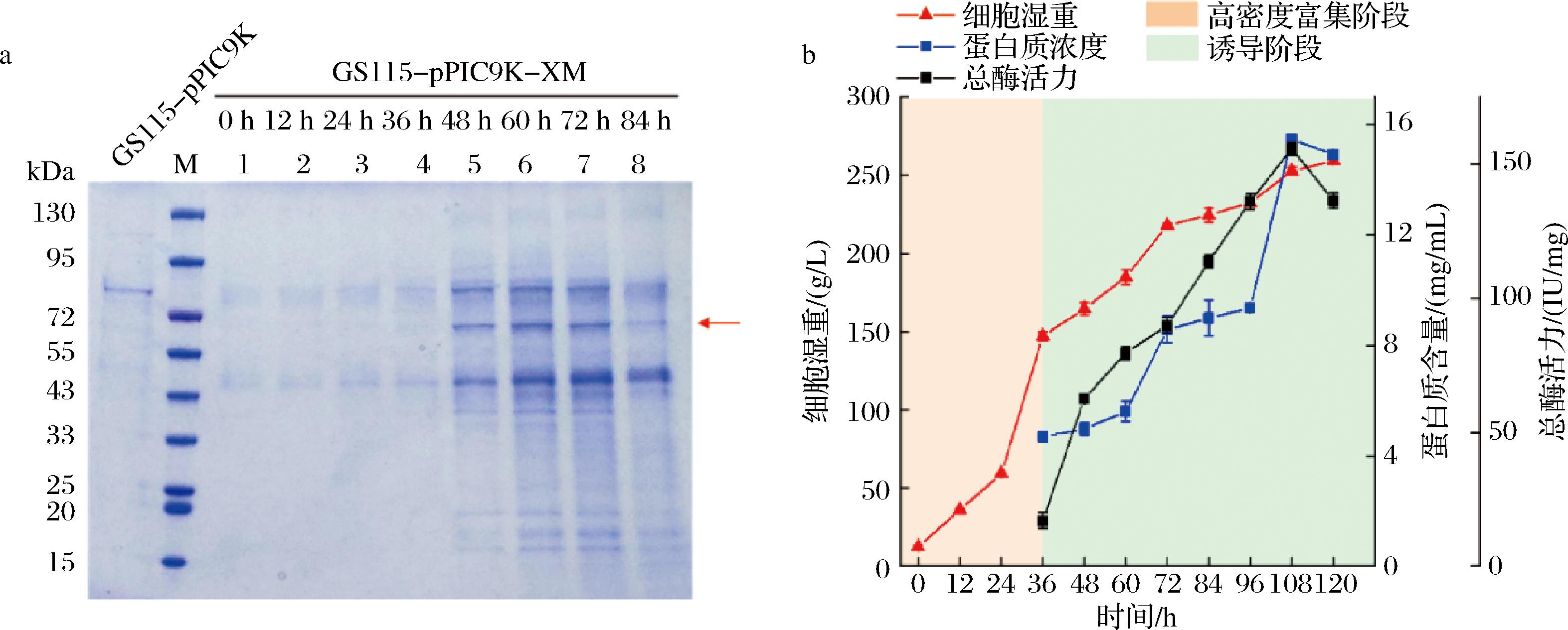 将表达成功且具有HCDC活性的阳性转化子进行高密度产酶发酵,发酵方法和培养基的制备参照毕赤酵母发酵工艺指南。将GS115-pPIC9K-XM新鲜单克隆接种到50 mL YPD液体培养基中,于30 ℃、220 r/min摇床中培养36 h。然后,以10%(体积分数)接种量将培养液接种至50 mL YPD液体培养基中,于30 ℃、220 r/min摇床中培养36 h。最后将300 mL成熟种子液接种到装有3 L BSM的7 L发酵罐中,发酵罐的最终工作体积为3.3 L。在甘油补料发酵阶段,用14.9 mol/L的氨水将pH控制在5左右,温度控制在30 ℃,初始搅拌速度为500 r/min,无菌空气的通气比为1.5 VVM[空气体积/(培养基体积·min)];在分批培养阶段,当甘油消耗殆尽,即溶解氧(dissolved oxygen,DO)反弹时,开始流加50 g/100 mL甘油,设定补料速率关联DO,使DO始终控制在20%~30%,流加4~8 h。饥饿2 h后,缓慢添加甲醇,将pH调节至5.5,并将转速保持在700 r/min,控制DO>20%,诱导表达4 d,诱导后的菌液于4 ℃、6 000×g离心5 min所得上清液即为粗酶液。每隔12 h取样1次,经4 ℃、6 000×g离心5 min,取上清液进行SDS-PAGE分析,并测定其蛋白含量及酶活力。