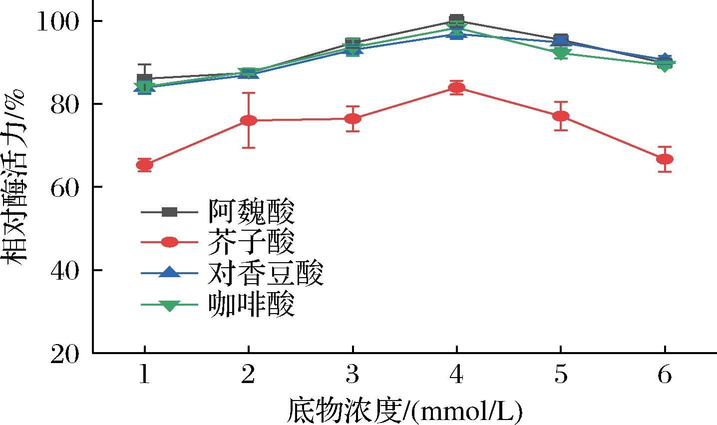 如图8所示,重组酶对4 mmol/L浓度下的4种底物均表现出较强的催化分解能力,其中对阿魏酸的催化分解能力最强,其次是咖啡酸、对香豆酸、芥子酸,相对酶活力最高分别达到98.28%、96.82%、83.92%,这与2.1节的研究结果一致。在以1~6 mmol/L咖啡酸、阿魏酸、对香豆酸为底物时,相对酶活力均达到80%以上,说明重组酶对这3种酸的脱羧能力较好。
