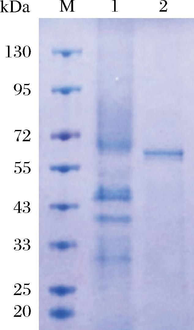 重组酶通过Ni NTA Beads 6FF层析柱进行纯化,纯化后经SDS-PAGE分析验证,在55 kDa和72 kDa之间有一条约为68 kDa清晰的蛋白条带(图6),与理论分子质量(58.1 kDa)相差约10 kDa,可能是由于阿魏酸脱羧酶XM的糖基化造成。