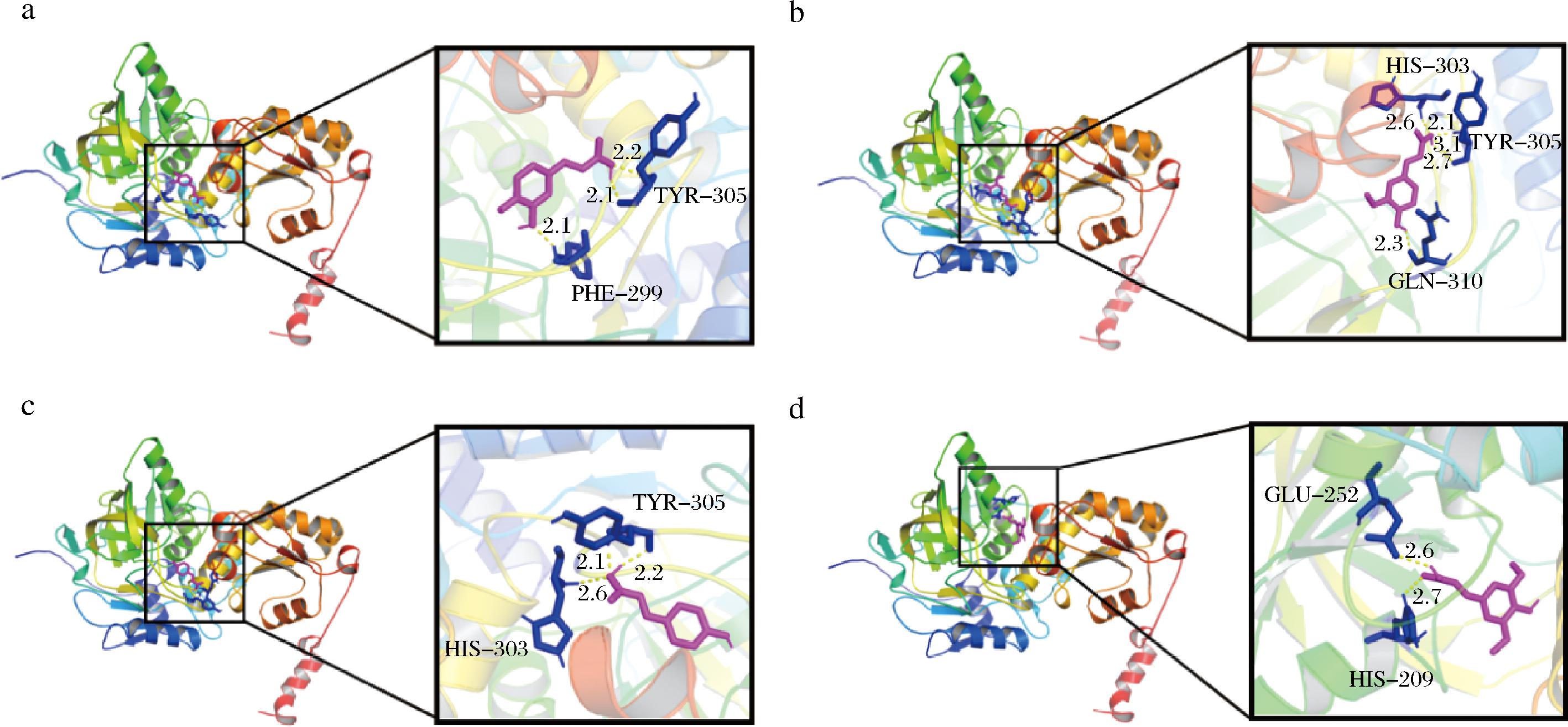为进一步验证阿魏酸脱羧酶XM的三维结构与4种底物(咖啡酸、阿魏酸、对香豆酸、芥子酸)的亲和力大小,采用AutoDockTools-1.5.7软件进行分子对接,结果表明,阿魏酸脱羧酶XM上的TYR-305、PHE-299两种氨基酸与小分子底物咖啡酸结合形成3个氢键(图2-a);阿魏酸脱羧酶XM上的HIS-303、TYR-305、GLN-310三种氨基酸与阿魏酸结合形成5个氢键(图2-b);阿魏酸脱羧酶XM上的TYR-305、HIS-303两种氨基酸与小分子底物对香豆酸结合形成3个氢键(图2-c);阿魏酸脱羧酶XM上的GLU-252、HIS-209两种氨基酸与小分子底物芥子酸结合形成2个氢键(图2-d),这些氨基酸残基可能影响阿魏脱羧酶XM的功能。
