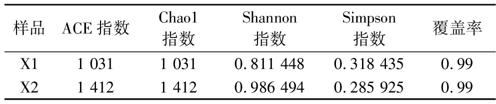 样品ACE指数Chao1指数Shannon指数Simpson指数覆盖率X11 0311 0310.811 4480.318 4350.99X21 4121 4120.986 4940.285 9250.99
