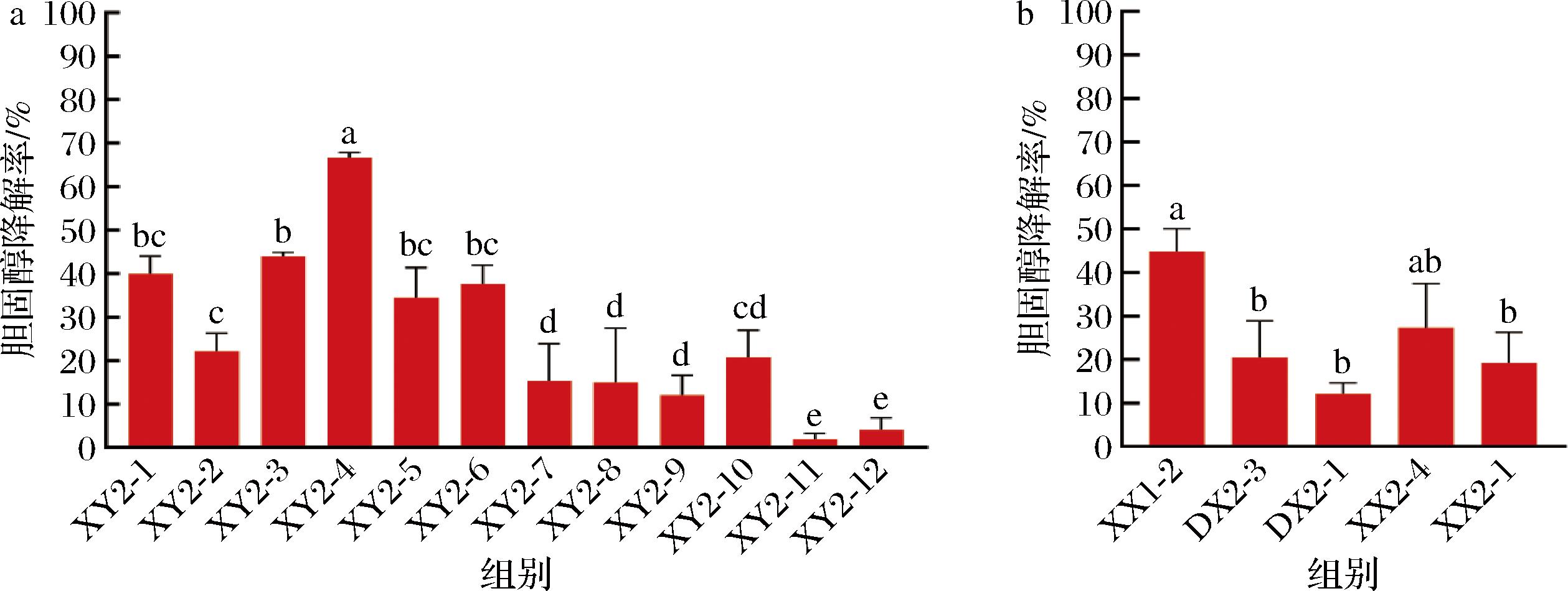 对获得的10株细菌和5株酵母菌进行体外胆固醇降解率的测定,结果如图5所示,细菌中乳酸肠球菌XY2-4胆固醇降解率最高,降解率为66.63%,其次是XY2-3,降解率为43.97%,除此之外,屎肠球菌XY2-1、乳酸肠球菌XY2-5和耐久肠球菌XY2-6的胆固醇降解率均大于30%。酵母菌中酿酒酵母XX1-2的胆固醇降解率最高,达到44.83%,4株马克斯克鲁维酵母中有2株降解率>20%。