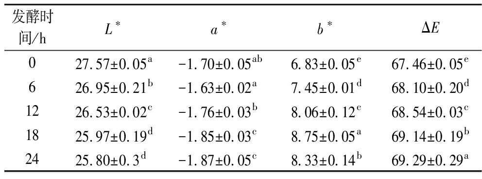 发酵时间/hL∗a∗b∗ΔE027.57±0.05a-1.70±0.05ab6.83±0.05e67.46±0.05e626.95±0.21b-1.63±0.02a7.45±0.01d68.10±0.20d1226.53±0.02c-1.76±0.03b8.06±0.12c68.54±0.03c1825.97±0.19d-1.85±0.03c8.75±0.05a69.14±0.19b2425.80±0.3d-1.87±0.05c8.33±0.14b69.29±0.29a