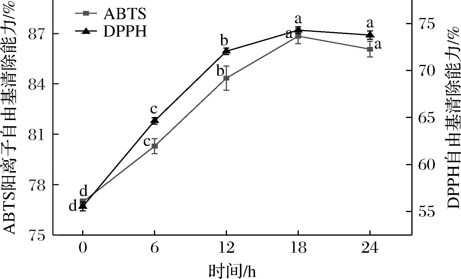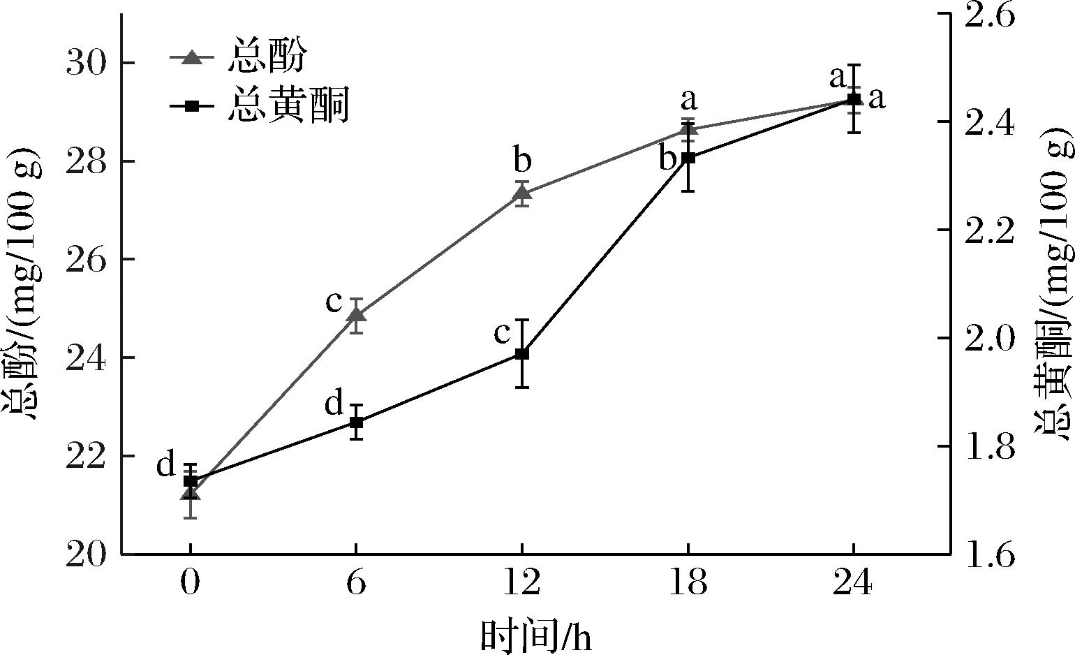 总酚与总黄酮是发酵饮料中重要的活性成分,对饮料的品质、功能性和稳定性具有关键作用。由图3可知,总酚、总黄酮随着发酵时间推移分别增长了37.86%和40.71%(P<0.05)。总酚含量快速上升至18 h后趋于稳定,由21.21 mg/100 g增长至29.24 mg/100 g。总黄酮则先缓慢增长,后期加速累积,18 h后趋于稳定,从1.73 mg/100 g增至2.44 mg/100 g。这一变化与ZHENG等[11]利用乳酸菌共发酵枸杞龙眼饮料总酚与总黄酮所呈现双阶段增长趋势相吻合。可能是由于乳酸菌的变化产生水解酶将复杂的酚类物质分解为更简单的形态,从而释放更多酚类[22],因此酚类前期呈上升趋势。而发酵后期由于累积了更多的酚类代谢成黄酮类化合物,故总黄酮含量后期呈上升趋势[13]。