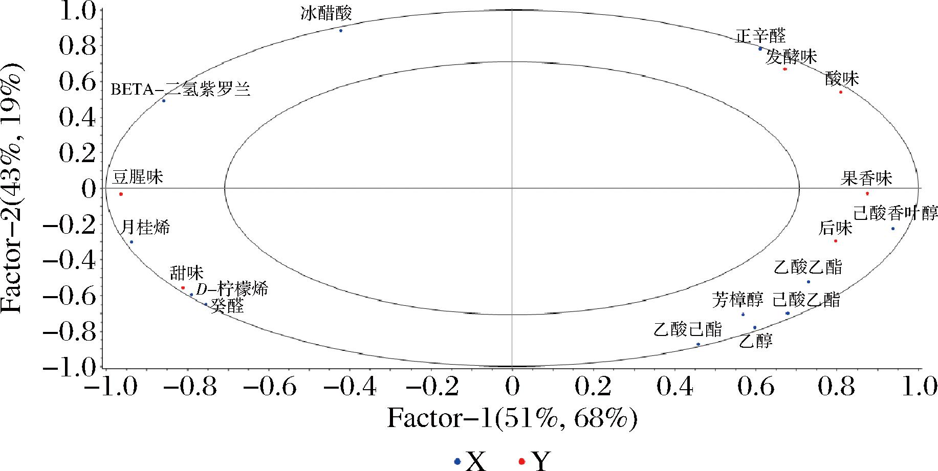 构建了偏最小二乘回归(partial least squares regression,PLSR) 模型以深入分析香气活性化合物与感官属性之间的关系,自变量为百香果豆清饮料中的12种香气活性化合物,因变量为通过感官定量描述分析得到的6个口感描述词。结果如图11所示,大椭圆代表100%的方差贡献率,而小椭圆则代表50%的方差贡献率。这2个椭圆分别对应着50%和100%的解释方差。PLSR模型显示2个显著的主成分,X与Y的大部分变量均位于椭圆区域内,这充分证明了PLSR模型在揭示香气活性化合物与感官属性之间相关性方面的精确性。值得注意的是,发酵味和酸味这2个感官属性在椭圆图中的位置相对集中,这不仅表明它们之间具有较高的相似度,还突显了它们对总方差的重要贡献。此外,图11还揭示了一个规律:距离感官属性越近的香气活性化合物,其对相应感官属性的影响也越大。具体而言,发酵味、酸味与正辛醇之间密切相关;果香味则与已酸香叶酯密切相关;后味与乙酸乙酯、己酸乙酯、乙酯己酸、芳樟醇、乙醇之间也呈现良好相关性;而甜味则与D-柠檬烯、葵醛有着紧密的相关性。PLSR模型的分析结果与感官评定的结果高度一致,进一步验证了模型的准确性和可靠性。