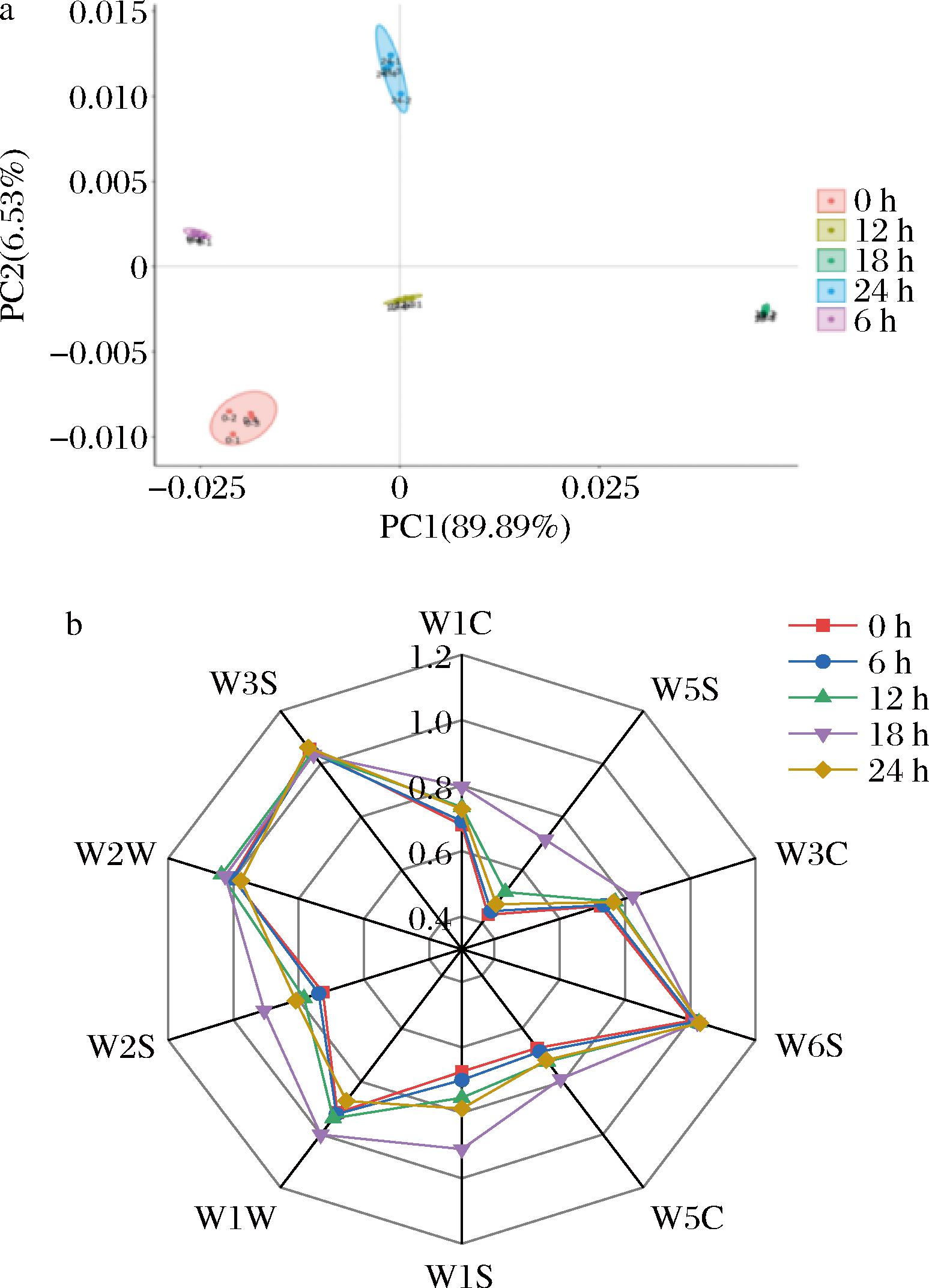 为评价乳酸菌发酵对百香果豆清饮料整体风味特征的影响,采用电子鼻测定差异。对电子鼻数据进行主成分分析(principal component analysis,PCA),由图6-a可知,PC1贡献率为89.89%、PC2贡献率为6.53%,累计贡献为96.42%,因此能够反映该发酵过程总体香气,5组样品分布于不同的象限内,表明发酵过程中存在显著性差异。由图6-b可知,发酵体系整体风味强度先增强后减弱的动态变化特征,在18 h时达到峰值,其中W1W、W2W、W3S、W6S的风味更为突出,其次为W2S、W1S。说明发酵时间18 h赋予更丰富的风味。