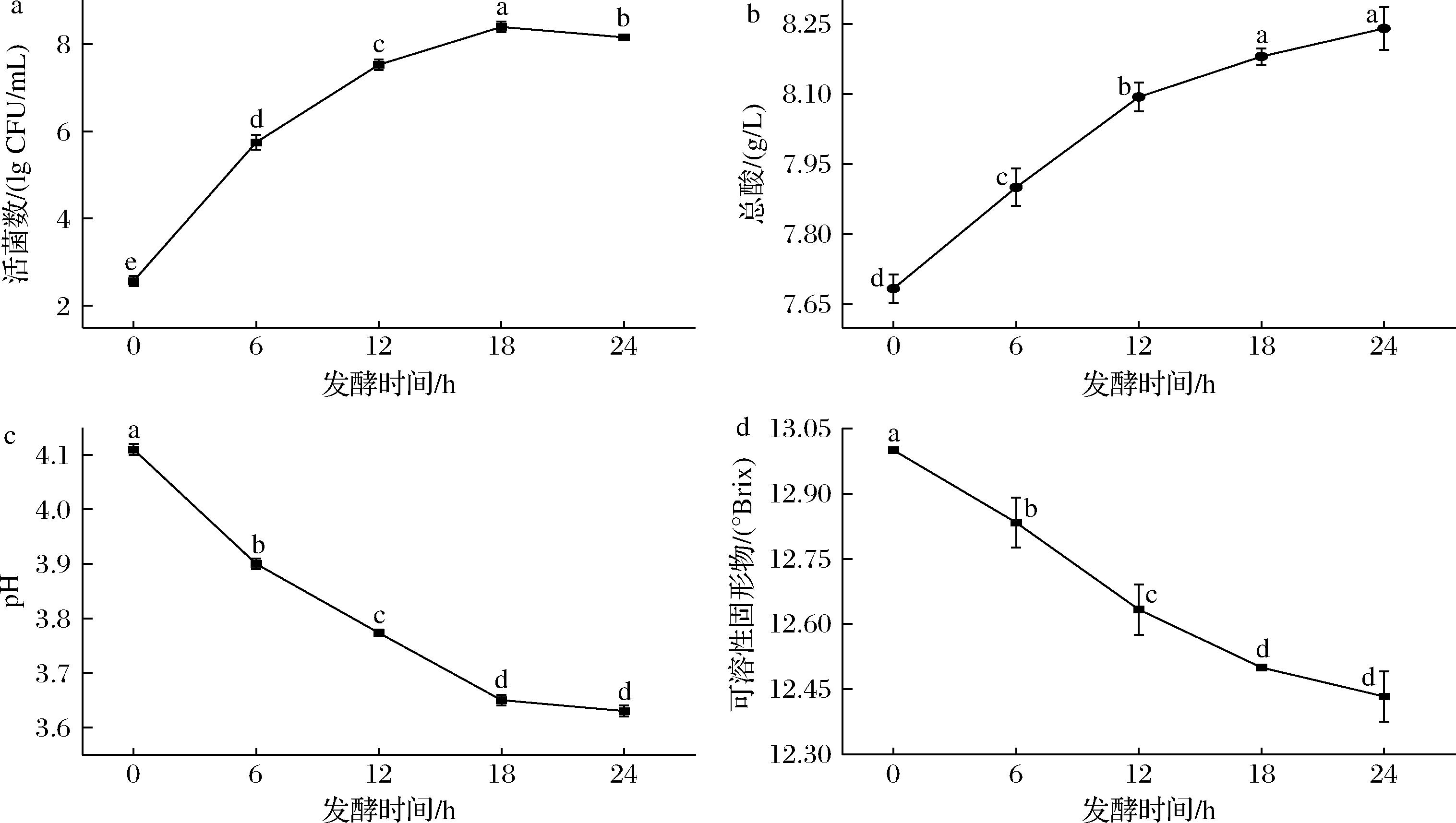 a-活菌数;b-总酸;c-pH;d-可溶性固形物