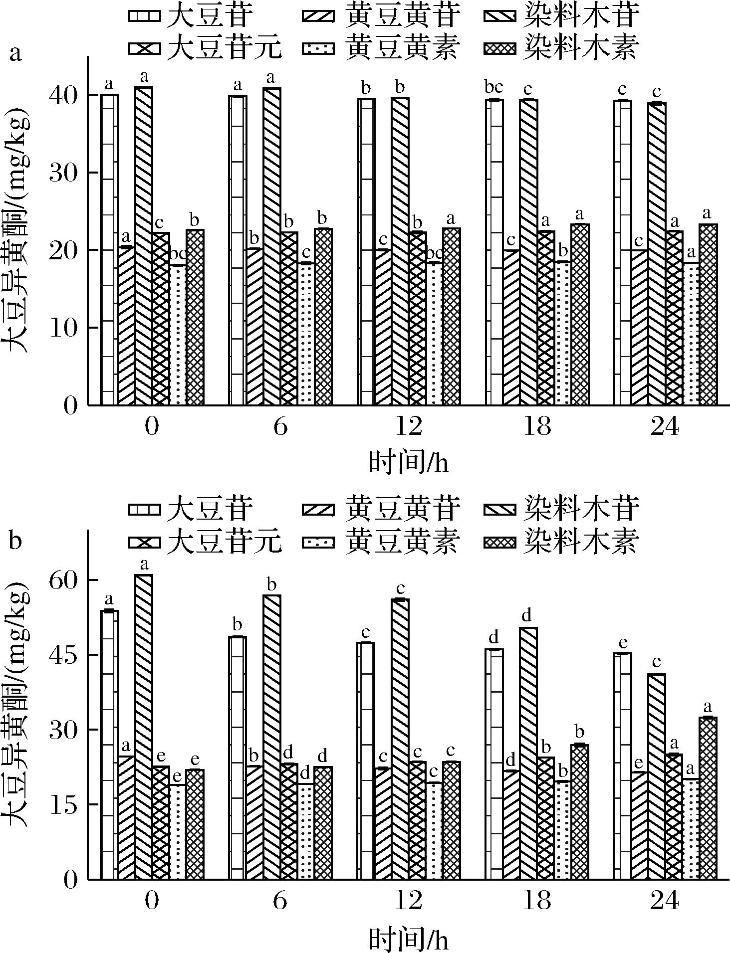大豆异黄酮是一类通过苯丙类途径合成的酚类化合物,具有抗氧化活性[23],为了进一步评价乳酸菌发酵对百香果豆清饮料营养物质的影响,在其他因素一致情况下,与纯豆清饮料进行对比。由图4-a可知,纯豆清饮料随着发酵时间的延长,葡萄糖苷型(大豆苷、黄豆黄苷、染料苷)均呈下降趋势,而苷元型(大豆苷元、黄豆黄素、染料木素)均呈上升趋势(P<0.05),这与欧红艳等[24]对于纯豆清发酵饮料的研究一致,也意味着纯豆清饮料具有很强的β-葡萄糖苷酶活性,可以将异黄酮糖苷水解成相应的苷元和葡萄糖[25]。图4-b添加百香果的豆清饮料随着发酵时间推移,葡萄糖苷型、苷元型整体发展趋势与纯豆清饮料趋势一致。值得注意的是,百香果豆清饮料发酵过程中,5个时间点的大豆苷、黄豆黄苷、染料木苷、大豆苷元、黄豆黄素、染料木素转化速率均比纯豆清液饮料慢,可能是因为添加了百香果产生酸性物质抑制β-葡萄糖苷酶活性[26]。