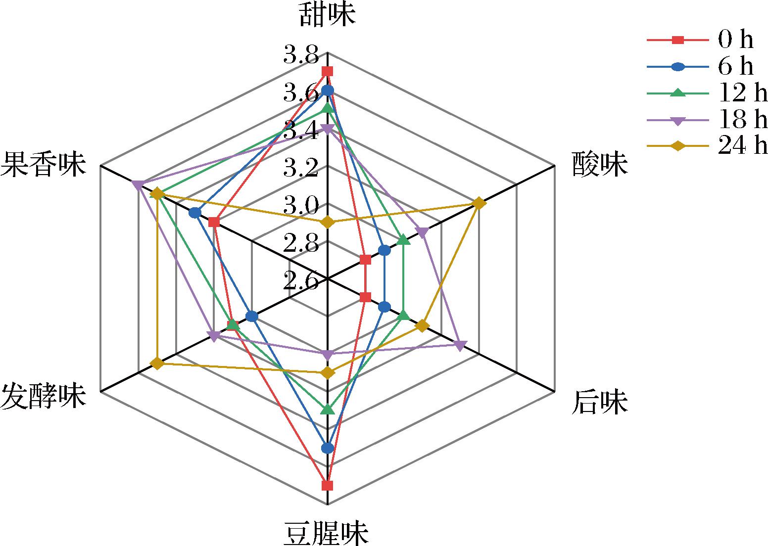 如图7所示,18 h果香味、后味最高,豆腥味最低,发酵味、酸味适中,相较于其余4组更佳。由此可知,发酵可以丰富百香果豆清饮料的果香味并掩盖豆腥味,从而提升感官品质。LI等[28]利用嗜酸乳杆菌发酵枣汁,增强其营养价值并提高整体感官品质。ZHOU等[21]研究发现,植物乳植杆菌发酵可改变杨梅汁的理化性质和生物活性,同时减少其不良感官风味。