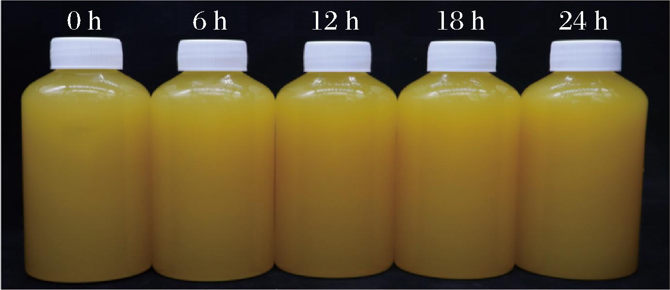 颜色是饮料的重要感官指标,通过L*、a*和b*以及总色差(ΔE)评估乳酸菌发酵对百香果豆清饮料颜色特性的影响[16]。由表2可知,随着发酵时间推移,L*值逐渐下降、a*、b*先增后减,总色差(ΔE)呈上升趋势,而b*于18 h达到峰值。表明随着发酵时间推移,饮料浑浊度升高,由清亮黄色向暗橙色发展,并于18 h达到稳定,具体饮料色泽如图1所示。这与LI等[17]在研究不同菌种发酵和田枣汁对其颜色影响时结果相似。可能归因于乳酸菌生长导致果汁浑浊度增加,亮度降低[18],同时pH降低导致类胡萝卜素异构化,从而增强黄色[16]。由此可见,乳酸菌发酵可有效提升百香果豆清饮料的颜色特征,使饮料的颜色向橙黄色方向延展,从而可能更加获得消费者的青睐。