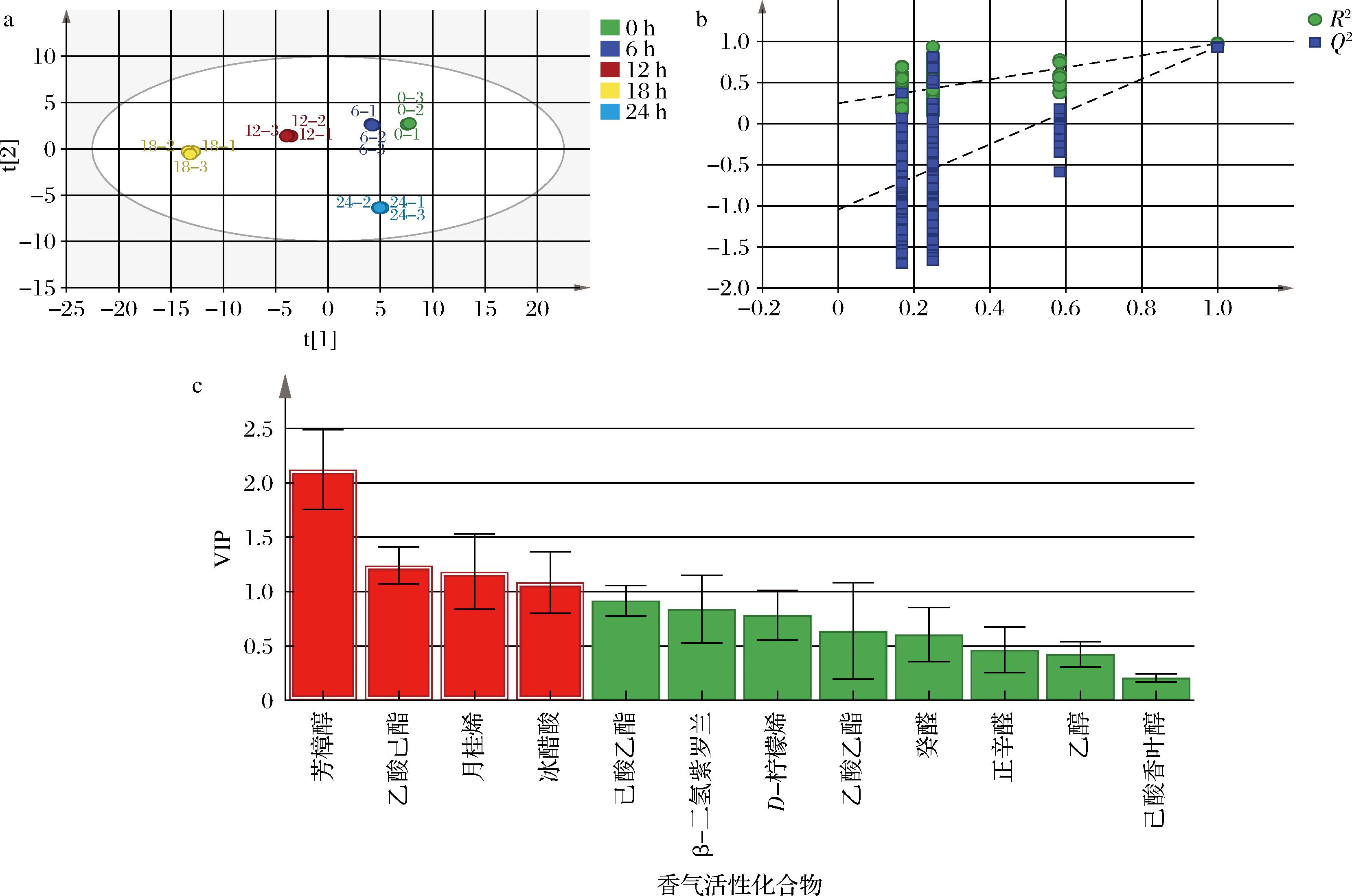 为进一步筛选乳酸菌发酵对百香果豆清饮料整体香气轮廓的关键香气化合物,采用正交偏最小二乘法判别分析(orthogonal partial least squares-discriminant analysis,OPLS-DA)对不同发酵时间段香气活性化合物进行分析。由图10-a可知,自变量拟合指数R2X=0.999,因变量拟合指数R2Y=0.964,模型预测指数Q2=0.909,R2、Q2均大于0.5,表示模型拟合可接受,且都接近1,表明该模型具有较强的预测能力。5个发酵阶段样品分布在不同区域,说明样品成分之间存在较大差异。此外,由图10-b可知,R2=0.247,Q2=-1.04,|Q2|>0.5,且Q2的回归线与Y轴的相交点均位于负半轴,说明该模型不存在过拟合现象,置换检验验证是可靠和有效的。进一步通过变量投影重要度(variable importance in projection,VIP)分析来衡量OPLS-DA模型中各挥发性物质的贡献。VIP>1,代表该挥发性物质为标志性风味物质。VIP值越大,代表该物质对整体风味的贡献越大。由图10-c可知,芳樟醇、乙酸己酯、月桂烯、冰醋酸的VIP值均大于1,因此它们可以作为区分百香果豆清饮料不同发酵时间整体香气轮廓的关键标志化合物。