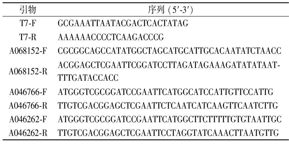引物序列 (5′-3′)T7-FGCGAAATTAATACGACTCACTATAGT7-RAAAAAACCCCTCAAGACCCGA068152-FCGCGGCAGCCATATGGCTAGCATGCATTGCACAATATCTAACCA068152-RACGGAGCTCGAATTCGGATCCTTAGATAGAAAGATATATAAT-TTTGATACCACCA046766-FATGGGTCGCGGATCCGAATTCATGGCATCCATTGTTCCATTGA046766-RTTGTCGACGGAGCTCGAATTCTCAATCATCAAGTTCAATCTTGA046262-FATGGGTCGCGGATCCGAATTCATGGCTTCTTTTTGTGTAATTGCA046262-RTTGTCGACGGAGCTCGAATTCCTAGGTATCAAACTTAATGTTG