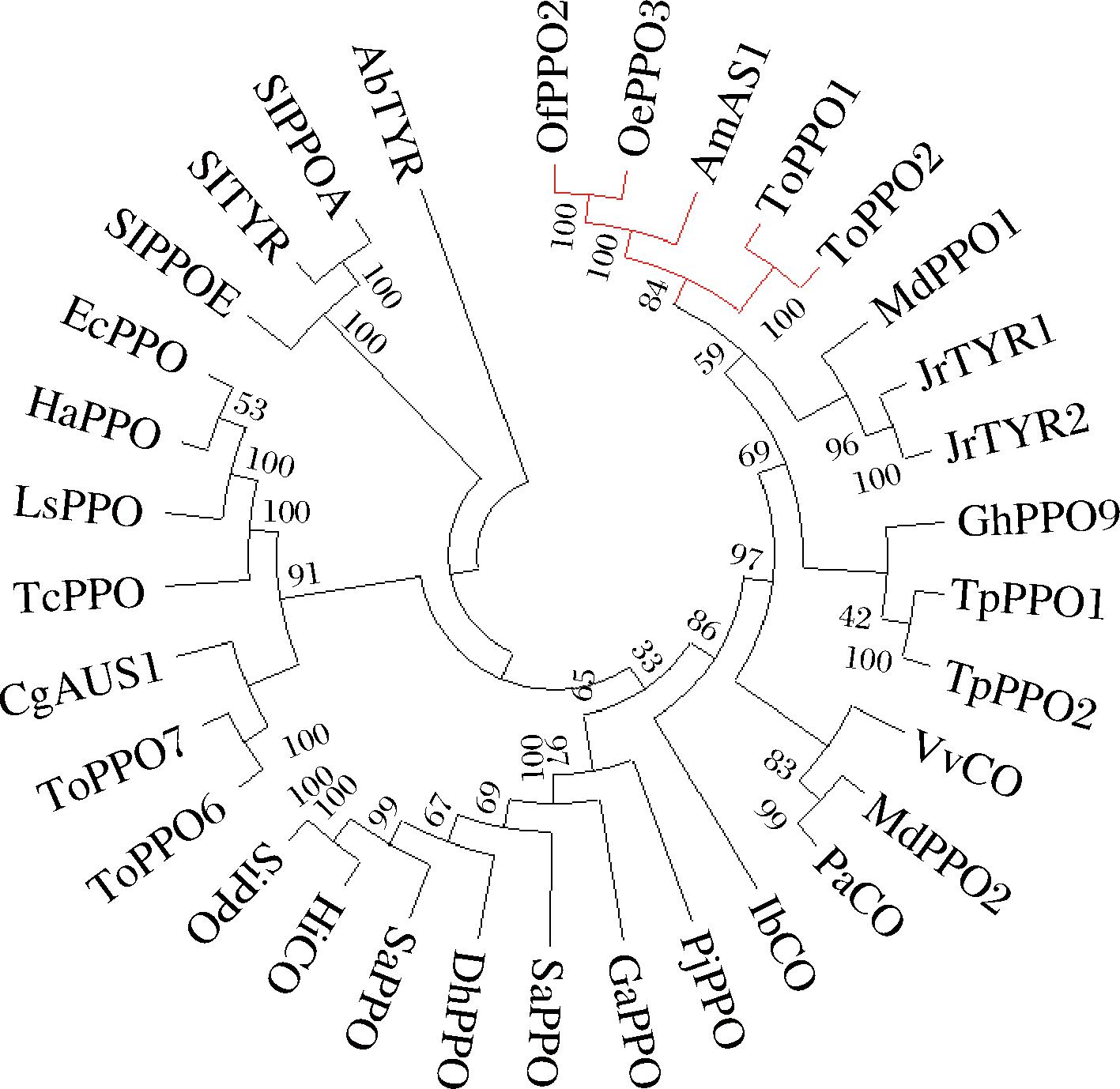 为了深入研究OePPO3的系统进化关系,采用MEGA11软件中的邻接法,将其与其他植物来源的PPO进行系统发育分析,构建系统发育树,结果如图9所示。OePPO3与4个酪氨酸酶(OfPPO2[19]、AmAS1[20]、ToPPO1[21]和ToPPO2[21])聚集在同一个小的分支上,其中OePPO3与桂花(Osmanthus fragrans)来源的OfPPO2具有较近的亲缘关系,它们的功能也极为相似,OfPPO2能够羟基化酪氨酸、酪醇、酪胺、4-羟基苯乙醛、红景天苷和桂叶苷A等多种单酚类底物,生成相应的邻苯二酚类中间体,从而参与毛蕊花糖苷的生物合成。