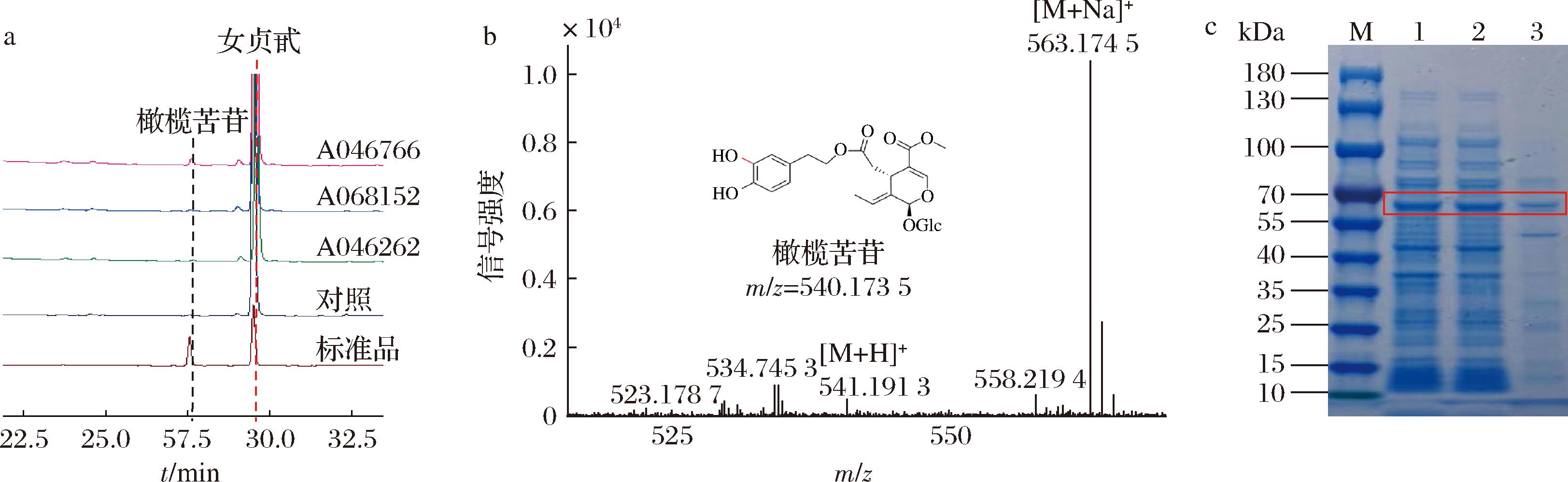 NCHEZ等[18]仅定性其属于酪氨酸酶,并未测定其对女贞甙的催化活性,也未证明其参与橄榄苦苷的生物合成途径。后续对OePPO3(A046766)进行了蛋白纯化,并采用SDS-PAGE分析蛋白的纯化情况,如图5-c所示,经过镍柱纯化后的蛋白条带较为单一,采用BCA试剂盒测定蛋白浓度,用于后续纯酶反应。