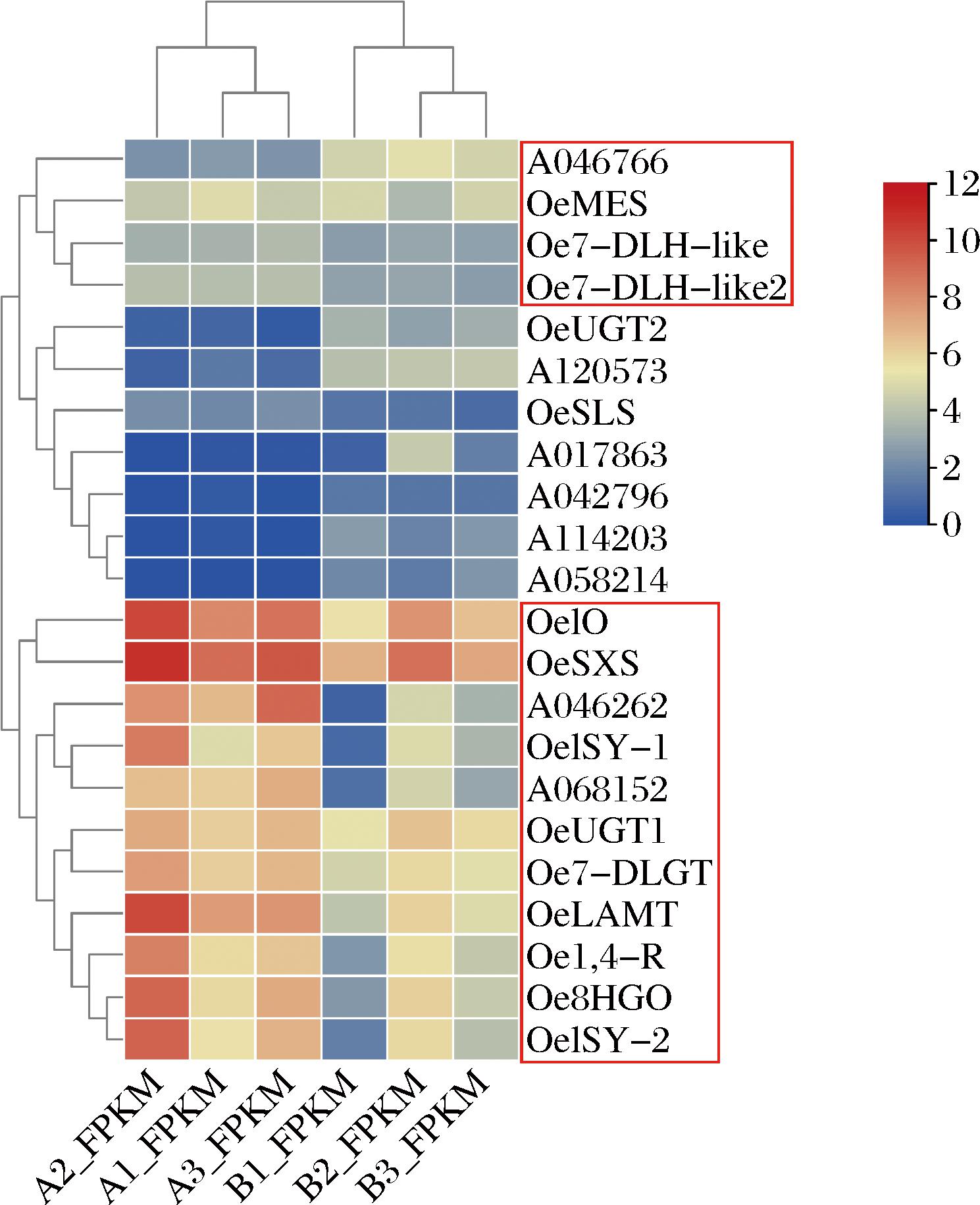 图3 PPO候选基因和报道的橄榄苦苷生物合成途径基因的聚类共表达分析