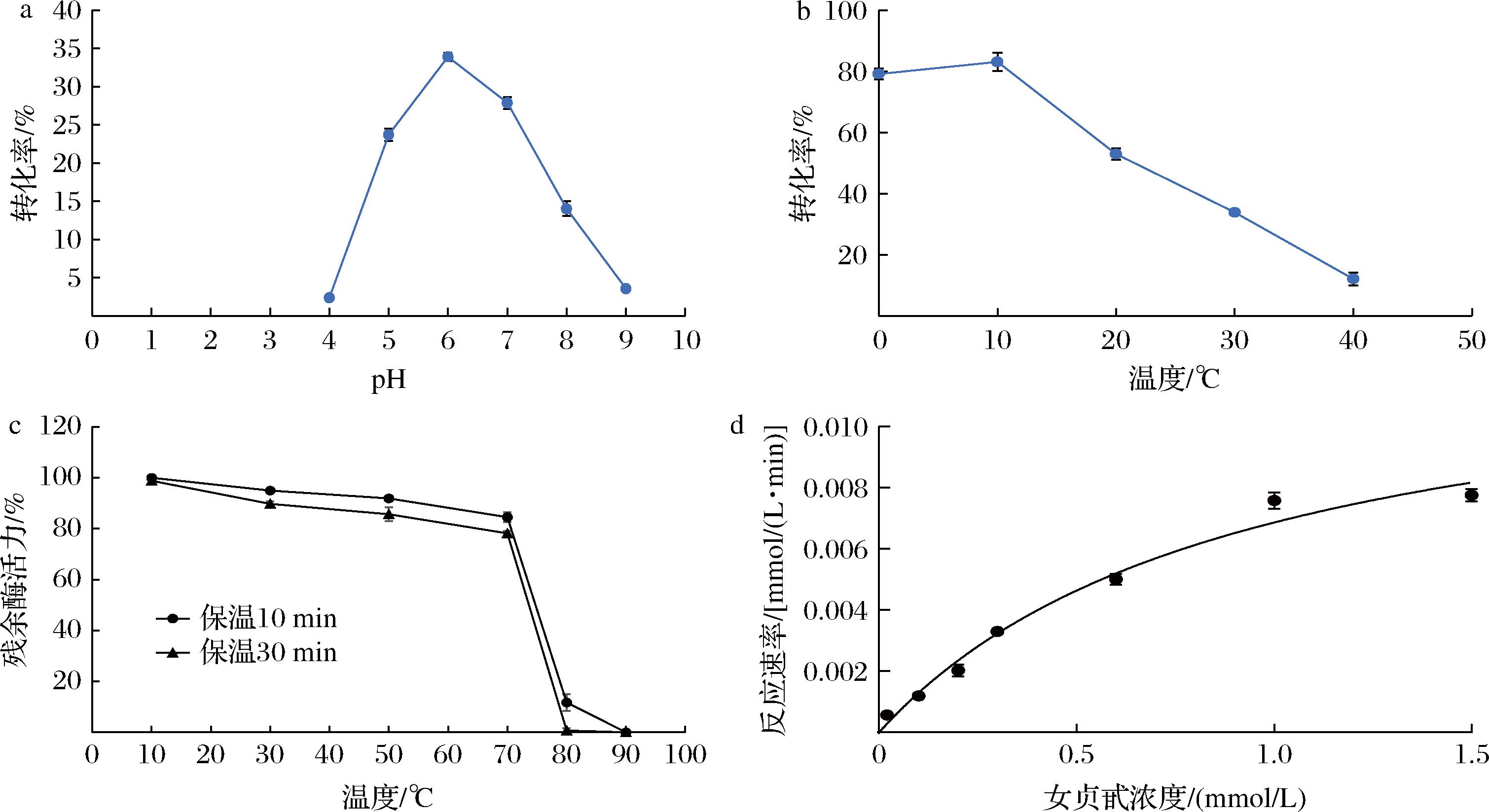 以女贞甙为底物,以SDS和Cu2+作为激活剂,以抗坏血酸作为抑制剂,系统探究了OePPO3在不同pH条件下的催化活性。如图6-a所示,pH对OePPO3的催化活性影响较为显著,在pH 6的PBS体系中表现出最高底物转化率,表明该酶的最适反应pH值为6;当pH值偏离6时,酶活性显著降低,当pH值为4和9时,酶催化底物的转化率降低到了5%以下。