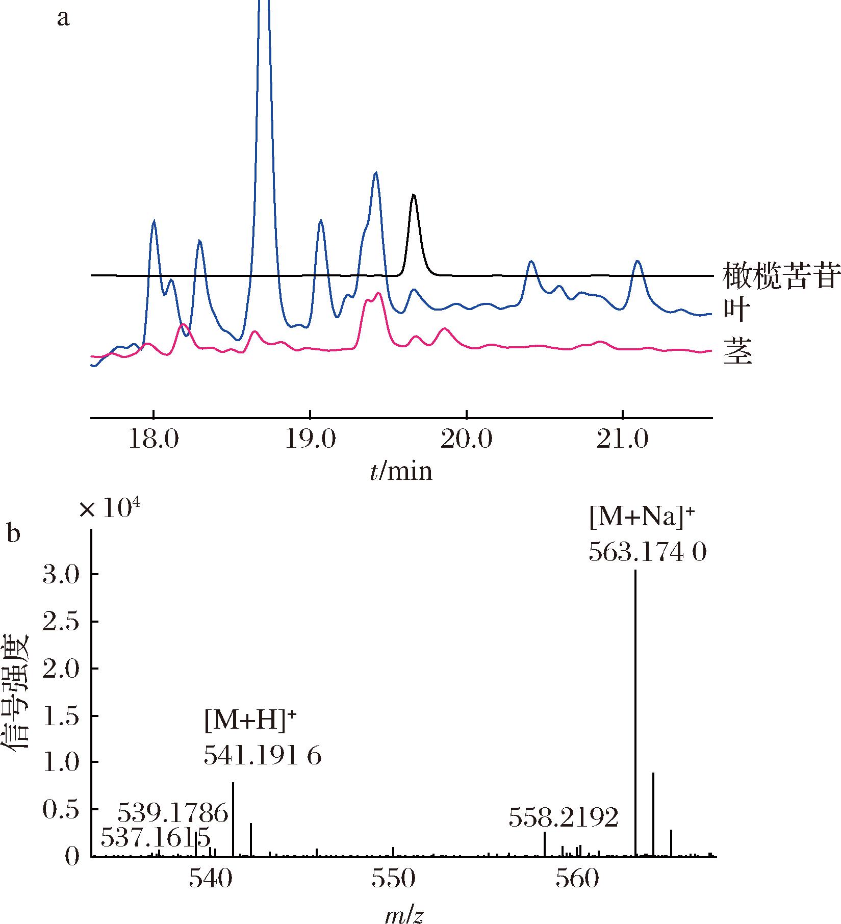 对油橄榄新鲜茎和叶中橄榄苦苷进行检测。HPLC的结果如图2-a所示,油橄榄的茎和叶中均存在与橄榄苦苷标准品保留时间一致的化合物,其中叶中含量显著高于茎中,并对其进行LC-MS检测,结果如图2-b所示,该化合物出现特征峰[M+H]+的m/z为541.191 6,[M+Na]+的m/z为563.174 0,与橄榄苦苷的理论分子质量一致。因此购买的油橄榄中含有橄榄苦苷,其叶中含量显著高于茎中,后续对油橄榄的茎和叶进行转录组测序。