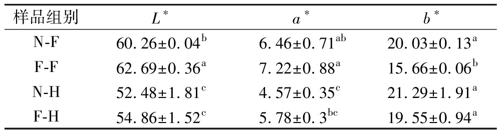样品组别L∗a∗b∗N-F60.26±0.04b6.46±0.71ab20.03±0.13aF-F62.69±0.36a7.22±0.88a15.66±0.06bN-H52.48±1.81c4.57±0.35c21.29±1.91aF-H54.86±1.52c5.78±0.3bc19.55±0.94a