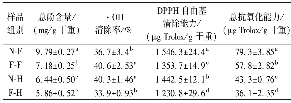 样品组别总酚含量/(mg/g干重)·OH清除率/%DPPH自由基清除能力/(μg Trolox/g 干重)总抗氧化能力/(μg Trolox/g 干重)N-F9.79±0.27a36.7±3.4b1 546.3±24.4a79.3±3.85aF-F7.18±0.25b40.6±2.53a1 353.7±14.9c57.8±2.82bN-H6.44±0.50c40.3±1.46a1 442.5±12.1b43.3±0.76cF-H5.86±0.52c33.9±0.93b1 230.8±29.6d36.1±2.35d