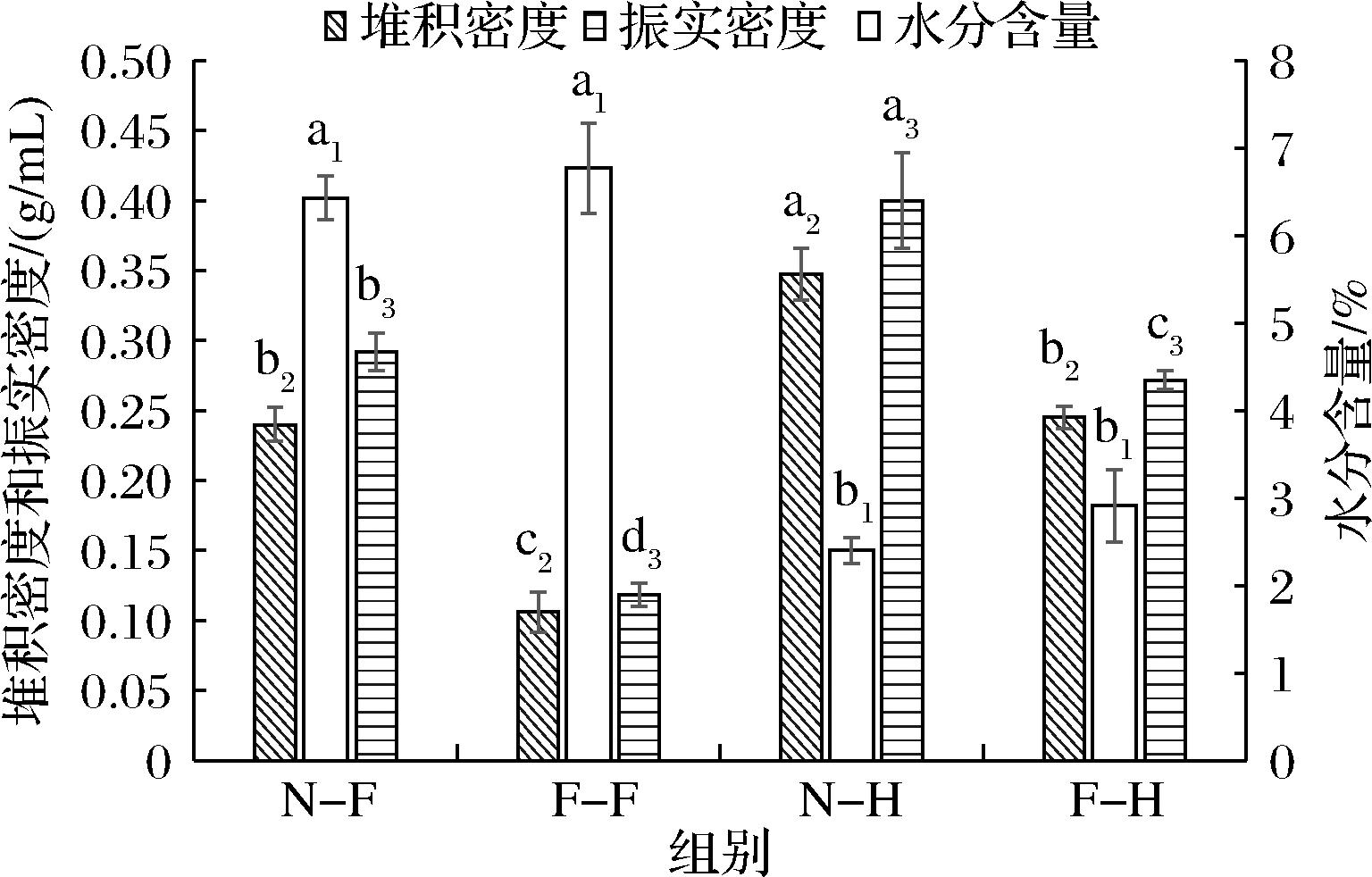图1 不同组分的水分含量、堆积密度和振实密度