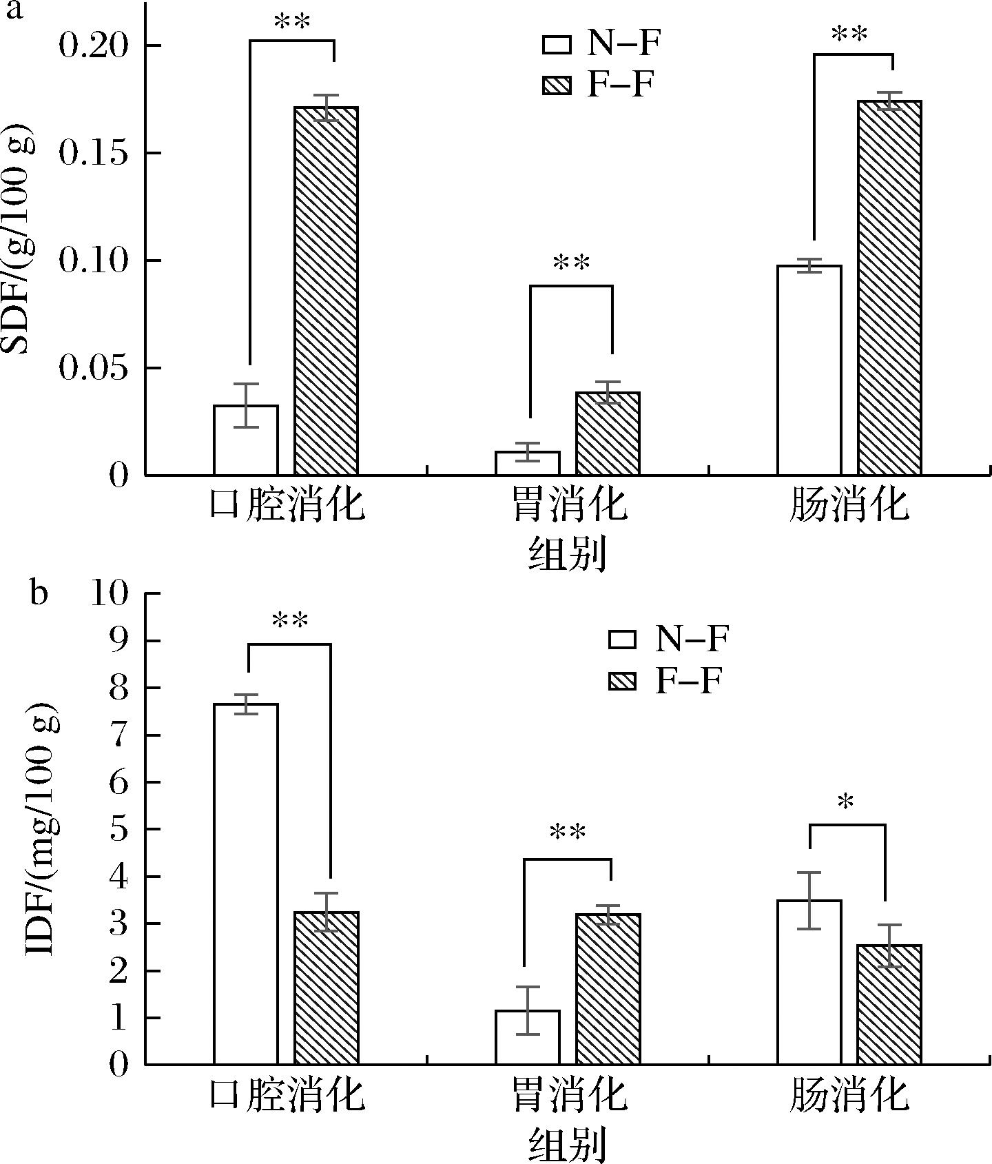 由图6-a可知,F-F在3种消化环境中的SDF含量均显著高于N-F,分别是N-F组的5.26、3.54、1.78倍,并且2组样品的IDF在消化过程中均呈现下降趋势,F-F下降趋势较缓(图6-b)。可能是由于SDF主要由果胶、葡聚糖等多糖组成,而微生物发酵的代谢活动产生的酶催化糖苷键断裂,促进IDF向SDF转化,对膳食纤维产生改性效果[23]。2组样品的SDF含量在消化过程中呈现先下降后上升的趋势,与总酚含量在消化过程的趋势相同。这可能是模拟胃消化环境使TDF中的多糖大分子产生沉淀,SDF含量减少,而在肠消化阶段由酸性条件过渡到包含胆盐及Na2CO3的温和碱性条件,使多糖大分子被分解为小分子,SDF含量增加[24],所以呈现先下降后上升的趋势。