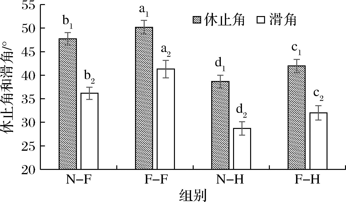 堆积密度和振实密度反映粉体颗粒自身大小和颗粒间空隙大小的状态,4组样品经过相同的80目过筛处理,粒径大小基本相同,在此情况下水分含量对堆积密度和振实密度影响较大。由图1可知,N-F、F-F水分含量较高,是N-H、F-H的2.3~2.7倍,而N-H、F-H的堆积密度和振实密度较高,是N-F、F-F的1~2倍,水分含量与堆积密度、振实密度呈负相关。这可能是由于冻干过程中,水分结成冰晶升华形成多孔结构,使粉体空隙变大,相同质量下体积变大,同时未升华的水分填充了粉体颗粒间的空隙,进一步增加粉质整体体积[7]。N-F、N-H堆积密度是F-F、F-H的1.4~2.3倍,与堆积密度相比,N-F、N-H振实密度增长15%~22%,而F-F、F-H振实密度增长11%左右。这是由于微生物发酵使苹果皮中碳水化合物被分解利用,细胞壁被破坏,使结构疏松化,颗粒间空隙变大[8],使得堆积密度变小,振实密度较堆积密度的增长幅度较小。