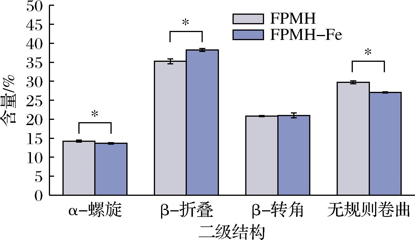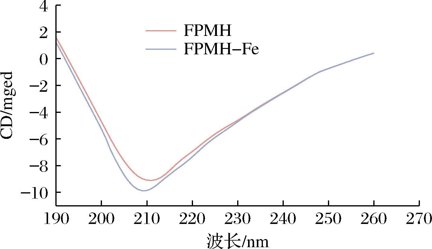 将FPMH和FPMH-Fe螯合物配制成0.2 mg/mL的溶液,然后使用CD仪测量。光谱扫描范围190~260 nm,扫描速度1 nm/s。然后用CDNN分析软件分析色谱数据并计算二级结构。