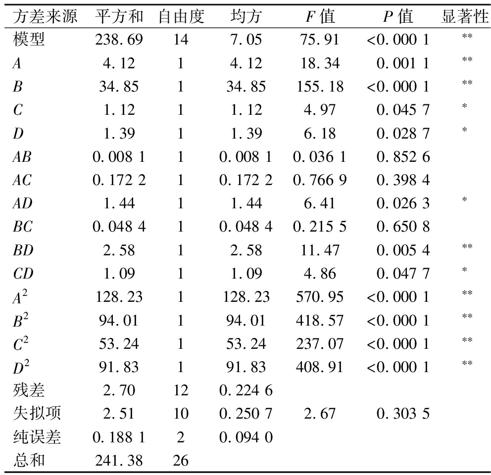 方差来源平方和自由度均方F值P值显著性模型238.69147.0575.91<0.000 1∗∗A4.1214.1218.340.001 1∗∗B34.85134.85155.18<0.000 1∗∗C1.1211.124.970.045 7∗D1.3911.396.180.028 7∗AB0.008 110.008 10.036 10.852 6AC0.172 210.172 20.766 90.398 4AD1.4411.446.410.026 3∗BC0.048 410.048 40.215 50.650 8BD2.5812.5811.470.005 4∗∗CD1.0911.094.860.047 7∗A2128.231128.23570.95<0.000 1∗∗B294.01194.01418.57<0.000 1∗∗C253.24153.24237.07<0.000 1∗∗D291.83191.83408.91<0.000 1∗∗残差2.70120.224 6失拟项2.51100.250 72.670.303 5纯误差0.188 120.094 0总和241.3826