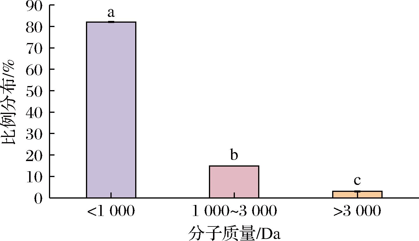 图2展示了FPMH的分子质量分布情况,分子质量<1 000 Da的肽段占比达到(82.10±0.28)%,是FPMH的主要成分。表明FPMH主要由小分子多肽构成。多肽的分子质量与其对金属离子的螯合活性有关。一般来说,分子质量较小的肽由于其结构较为松散,更容易暴露出活性基团而有利于与Fe2+形成螯合物[17]。此外,较小体积的肽由于氨基和羧基的比例较高,可能会展现出更高的铁螯合活性[18]。SUN等[19]的报道显示,海参卵水解物的铁螯合能力随着分子质量的减小而显著增加。