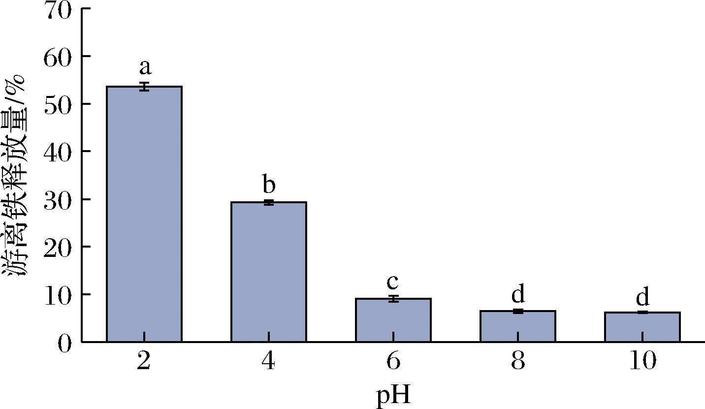 如图10所示,随着pH值的升高,FPMH-Fe的游离铁释放量呈先降低后不变的总体趋势。在强酸性条件下(pH值为2),游离铁释放率达到最高值(53.58±1.47)%。这表明在较低的pH条件下,FPMH-Fe螯合物的稳定性较差,导致Fe2+从螯合物中解离出来。其可能原因是高浓度的H+能将肽从其与Fe2+的结合位点上置换出来[11]。而在接近中性和碱性条件下,FPMH-Fe螯合物表现出较高的稳定性,游离铁释放率均保持在较低水平(约7%)。