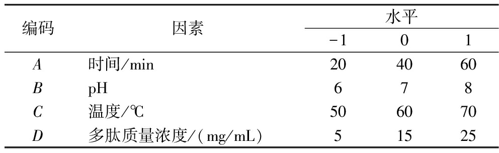 编码因素水平-101A时间/min204060BpH678C温度/℃506070D多肽质量浓度/(mg/mL)51525