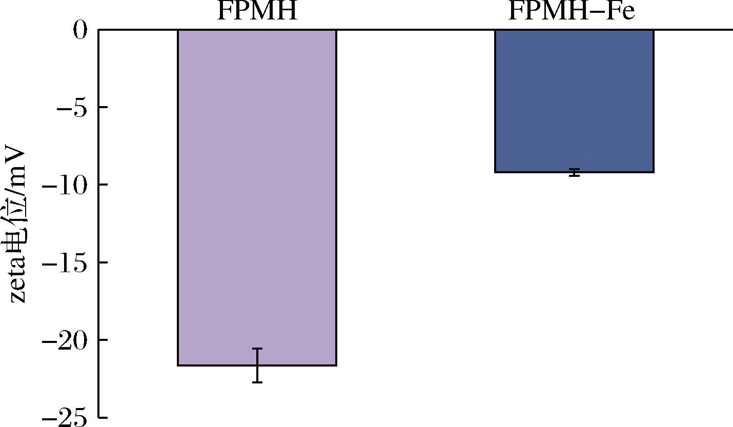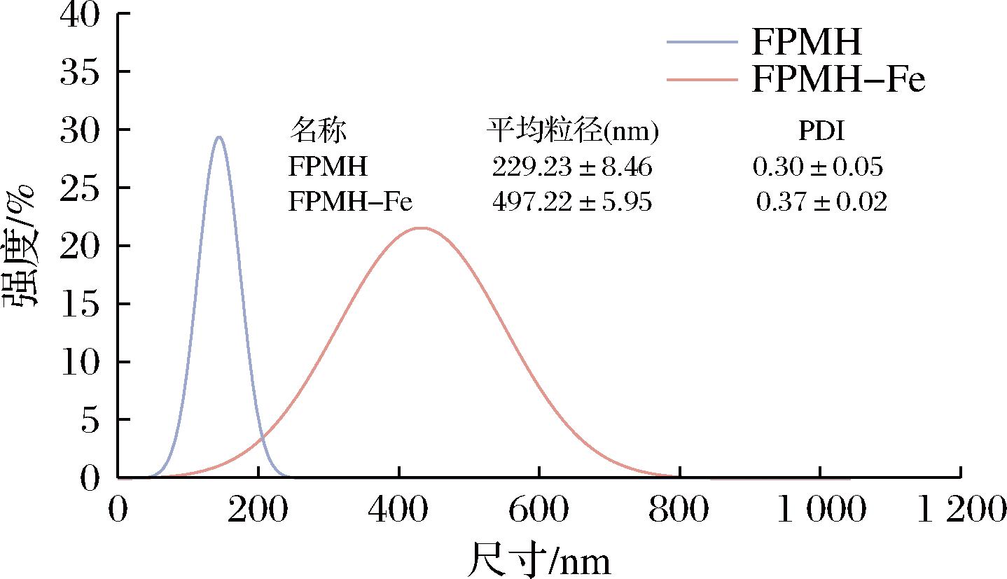 将FPMH和FPMH-Fe螯合物配成0.5 mg/mL的溶液,采用纳米粒度及zeta电位分析仪,在固定散射角度90 °,25 ℃下平衡60 s,测定粒径、zeta电位和多分散性指数(polydispersity index,PDI)。