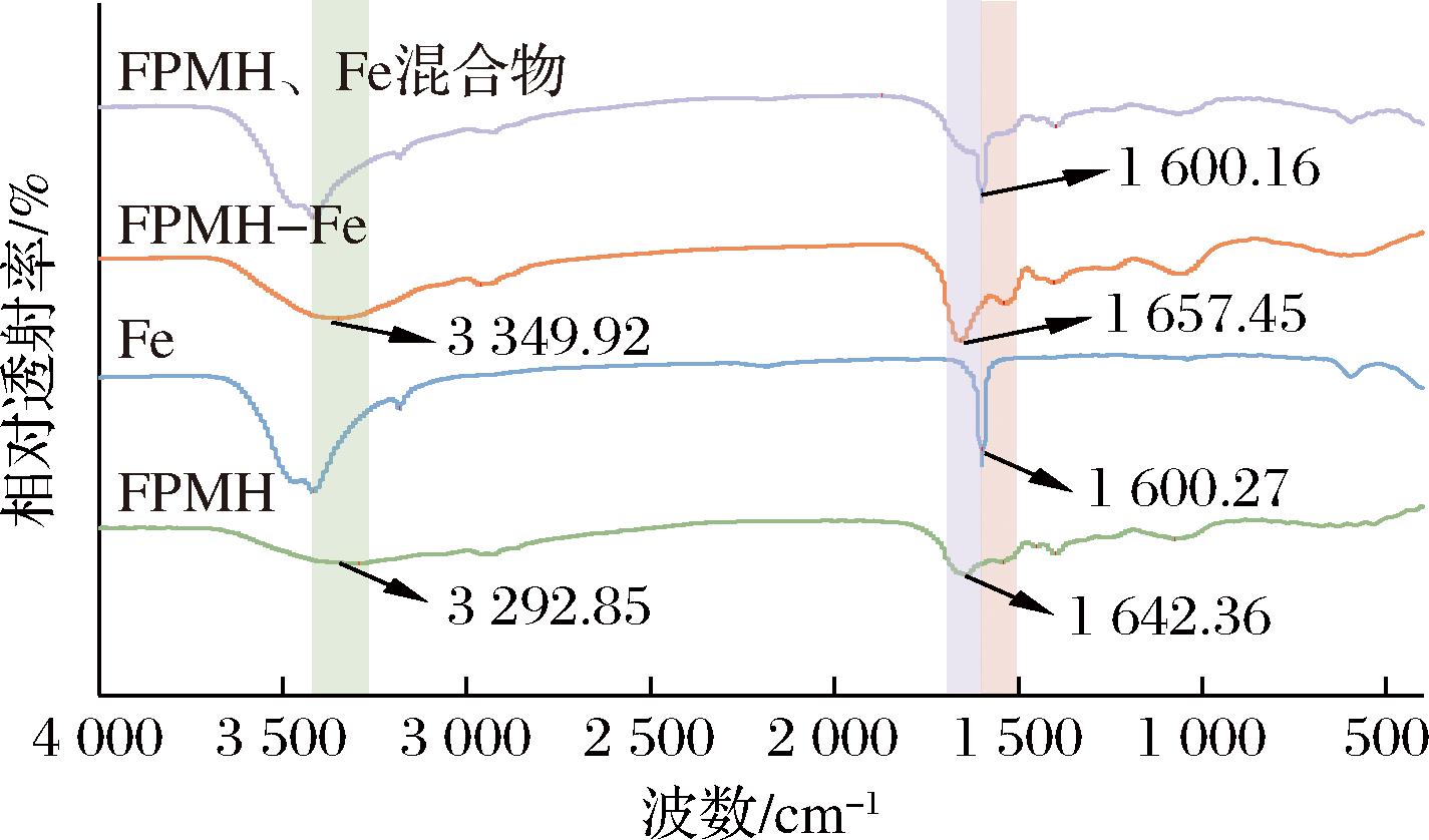 将FPMH、FPMH-Fe、FeCl2·4H2O以及FPMH与FeCl2·4H2O的物理混合物的冻干粉末分别与KBr按1∶100的质量比混合研磨,压制成薄片后,使用傅里叶变换红外光谱仪进行扫描分析。扫描范围为4 000~400 cm-1,以4 cm-1的分辨率进行64次扫描。