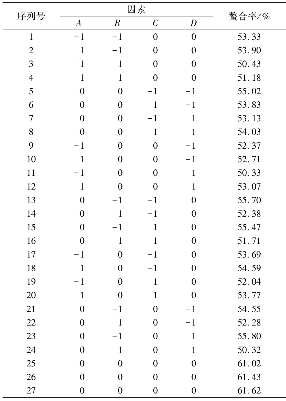 序列号因素ABCD螯合率/%1-1-10053.3321-10053.903-110050.434110051.18500-1-155.026001-153.83700-1153.138001154.039-100-152.3710100-152.7111-100150.3312100153.07130-1-1055.701401-1052.38150-11055.4716011051.7117-10-1053.691810-1054.5919-101052.0420101053.77210-10-154.5522010-152.28230-10155.8024010150.3225000061.0226000061.4327000061.62