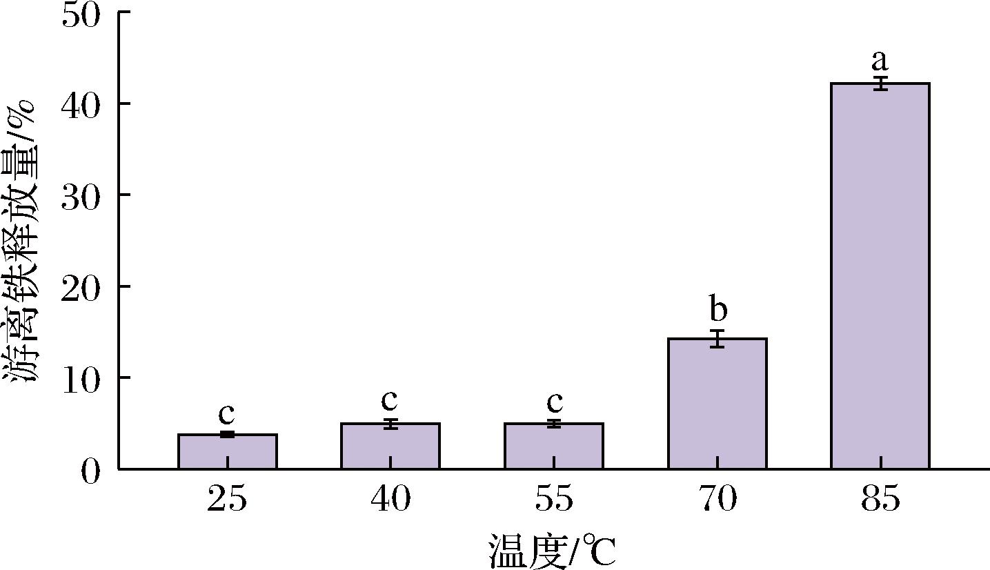 如图11所示,在25~55 ℃,FPMH-Fe的游离铁释放率保持在较低水平,且不同组间无显著差异。随着温度升高,铁释放率呈上升趋势,温度达到70 ℃时,游离铁释放率为(14.24±1.58)%,仍处于较低水平;而当温度升高至85 ℃时,铁释放率达到最高值(42.17±1.16)%。这可能是因为高温加剧了分子间的热运动,导致螯合物的稳定性降低,从而使Fe2+更容易从螯合物中解离出来。