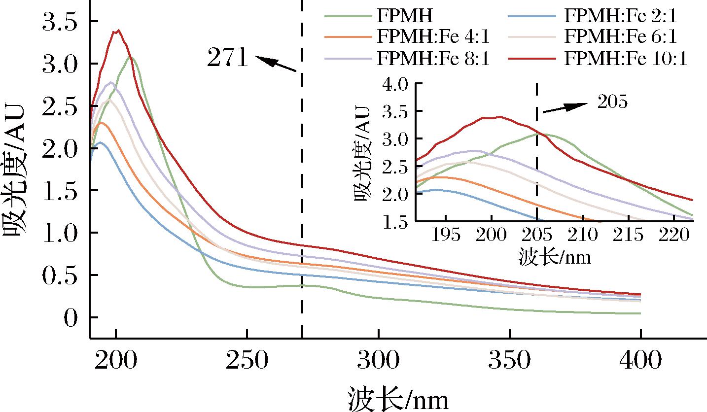 将FPMH和FPMH-Fe粉末配制成0.2 mg/mL的溶液,使用紫外-可见分光光度计在190~400 nm波长进行全波长扫描。