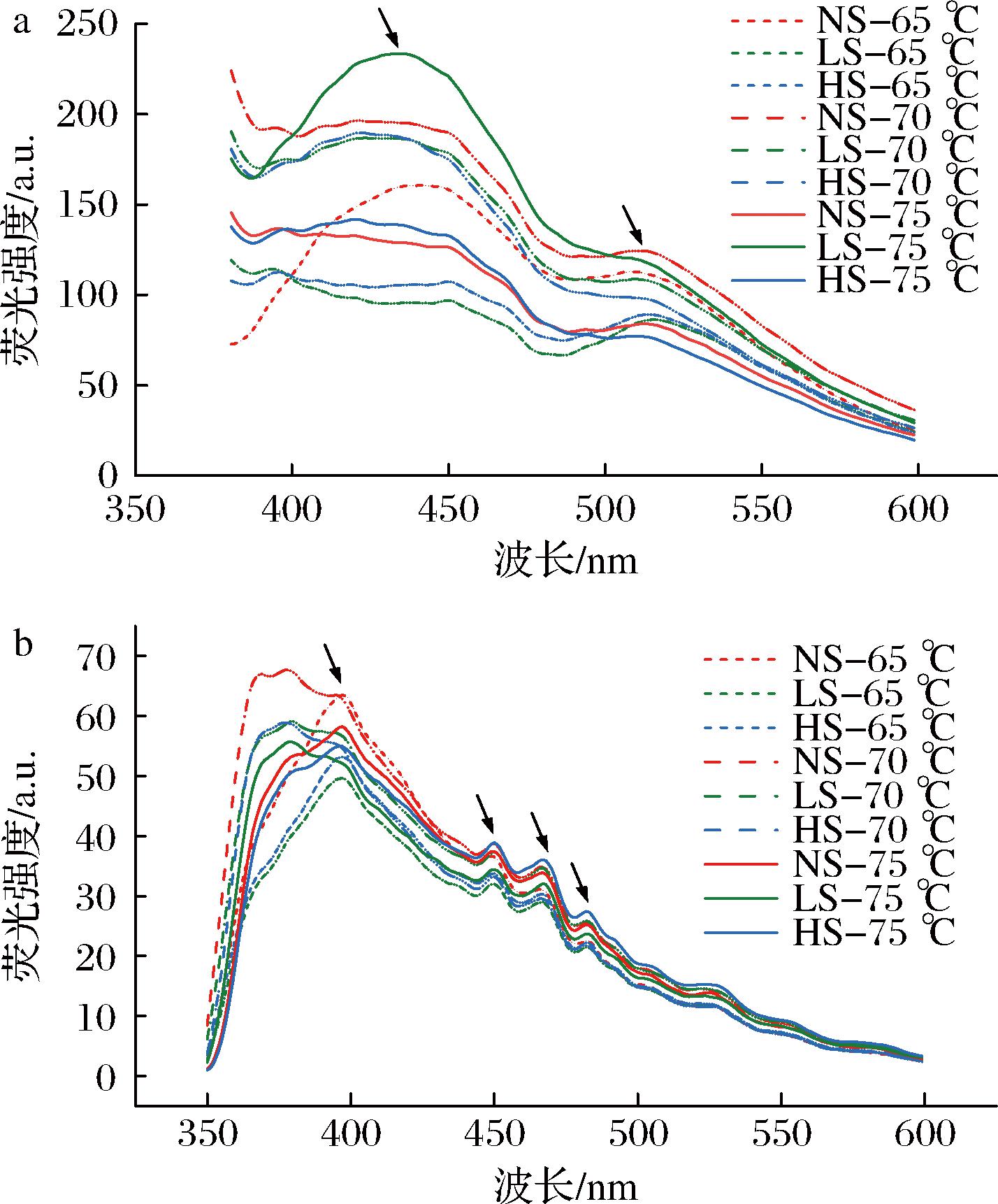 席夫碱与荧光AGEs均为水产品烹饪过程中的美拉德反应产物,分别生成于美拉德反应的初始阶段和终末阶段,均具有较强的荧光特性[18]。实验分别使用360 nm与325 nm的激发波长检测席夫碱与荧光AGEs的荧光强度,以表征其含量。席夫碱荧光强度如图6-a所示,本研究分别在440 nm和520 nm处观察到2个明显的荧光峰,这与JIANG等[3]的研究一致;结果显示,当牡蛎烹饪中心温度达到65、70 ℃时,与LS和HS组牡蛎相比,NS组均荧光强度较小,说明相对于传统烘烤,蒸汽辅助烘烤对美拉德反应的早期阶段可能有一定抑制作用;烹饪中心温度达到75 ℃时,LS组的席夫碱含量最高,而NS与HS组牡蛎的席夫碱含量呈下降趋势,并均低于LS组,推测由于产生的席夫碱参与美拉德反应到下一阶段的Amadori重排当中[19]。