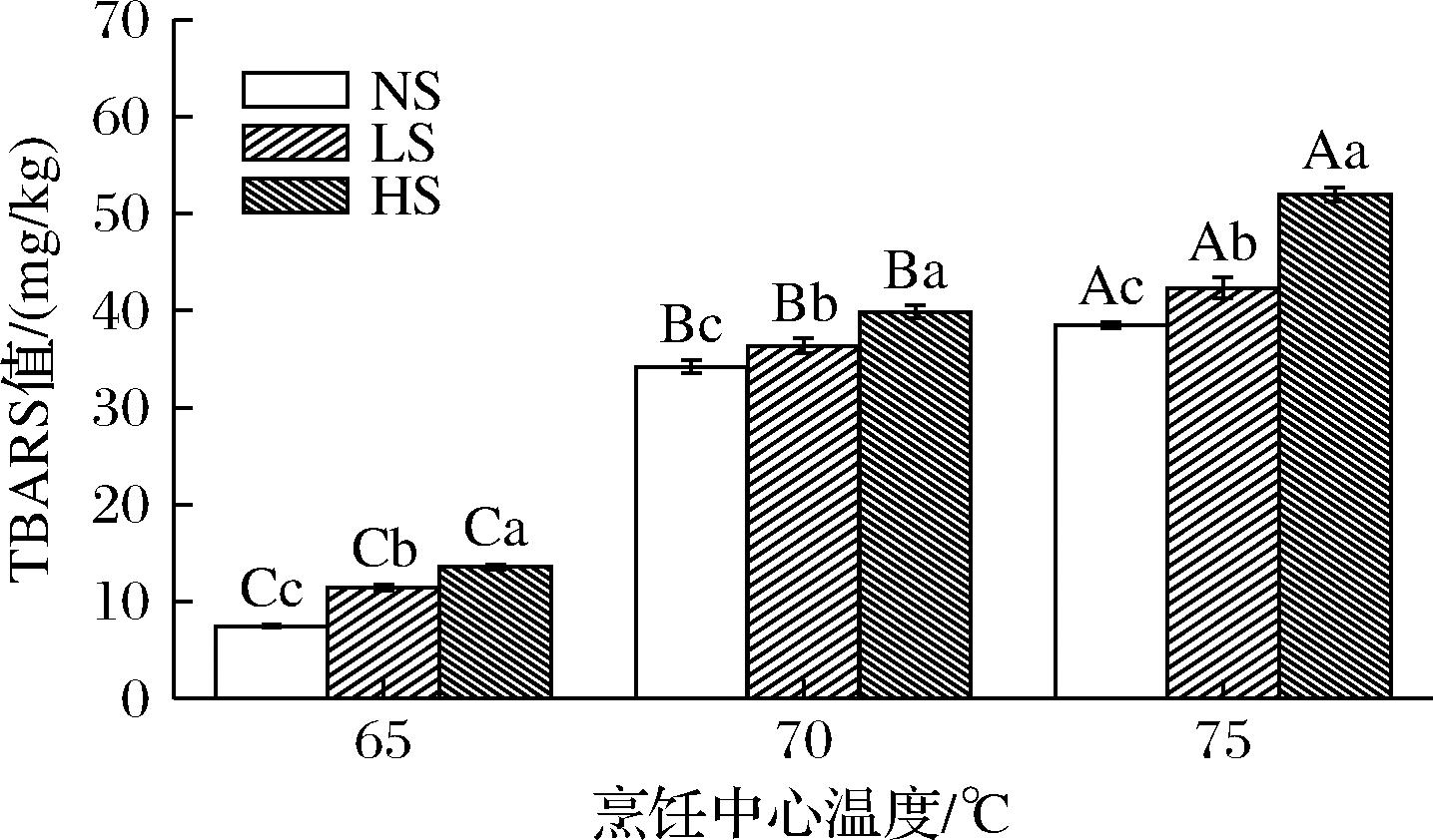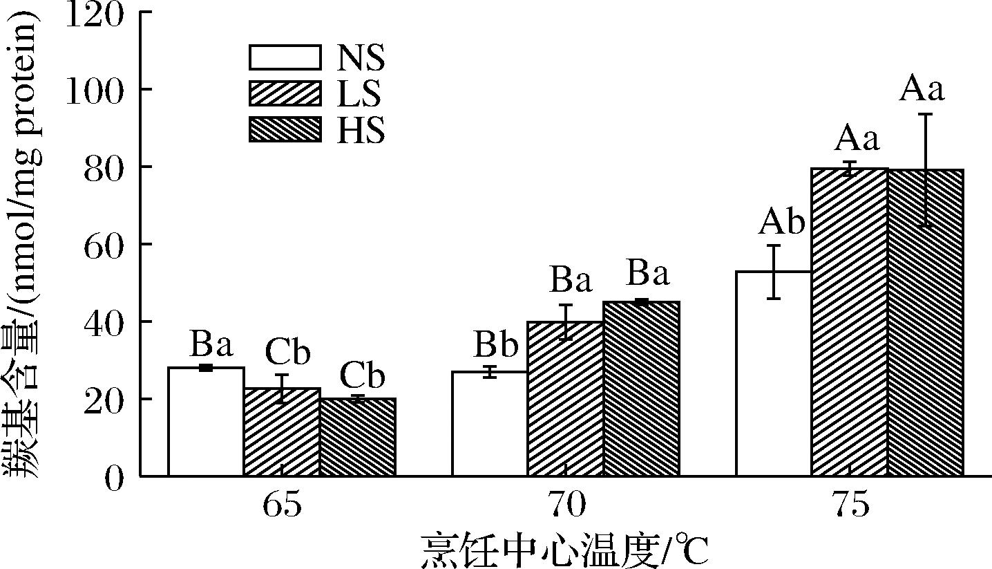 在食品热加工过程中,脂肪氧化产物攻击蛋白质侧链并形成羰基,因此羰基是衡量蛋白氧化程度的重要指标[15]。如图4所示,随烹饪中心温度提高,各组牡蛎的羰基含量均显著提高,说明烘烤使牡蛎蛋白氧化程度增加;在65 ℃的烹饪中心温度下,蒸汽辅助烘烤使牡蛎羰基含量显著降低(P<0.05),而烹饪中心温度达到70、75 ℃时,蒸汽辅助烘烤则使牡蛎羰基含量分别产生30%~40%的显著提升(P<0.05),不同烹饪中心温度下LS与HS组均无显著差异(P>0.05)。蒸汽辅助烘烤对牡蛎蛋白羰基的形成可能具有先抑制后促进的作用,推测在较低的烹饪中心温度下,蒸汽相较烘烤对牡蛎传热的贡献更大,因此蒸汽辅助烘烤的传热方式更接近于蒸制,而蒸制是使动物蛋白羰基化程度较小的热处理方式之一[16],而烹饪中心温度较高时,蒸汽促进蛋白氧化,推测较高的湿度可能促进了氧化反应。