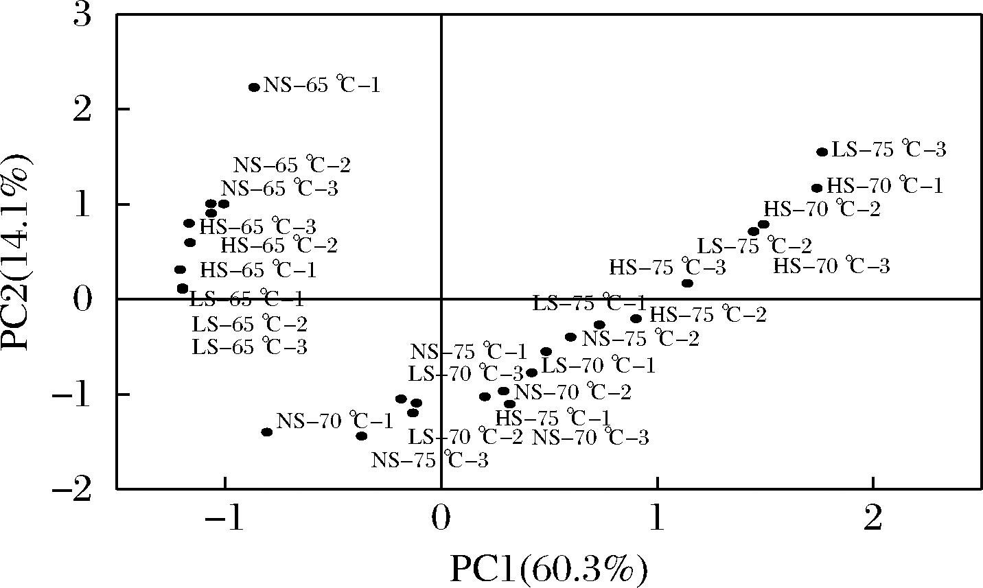PCA结果如图8所示,结果表明,当牡蛎的烹饪中心温度达65 ℃时,不同的烹饪方式对牡蛎的挥发性风味影响相近;值得注意的是,NS-75 ℃与LS-70 ℃,以及LS-75 ℃与HS-70 ℃的挥发性风味特征较为近似,推测可能由于蒸汽通过促进蛋白、脂质氧化,促使牡蛎的挥发性风味在更低的烹饪中心温度下趋近成熟状态,这与前文的牡蛎蛋白羰基含量和TBARS值的测定结果一致。