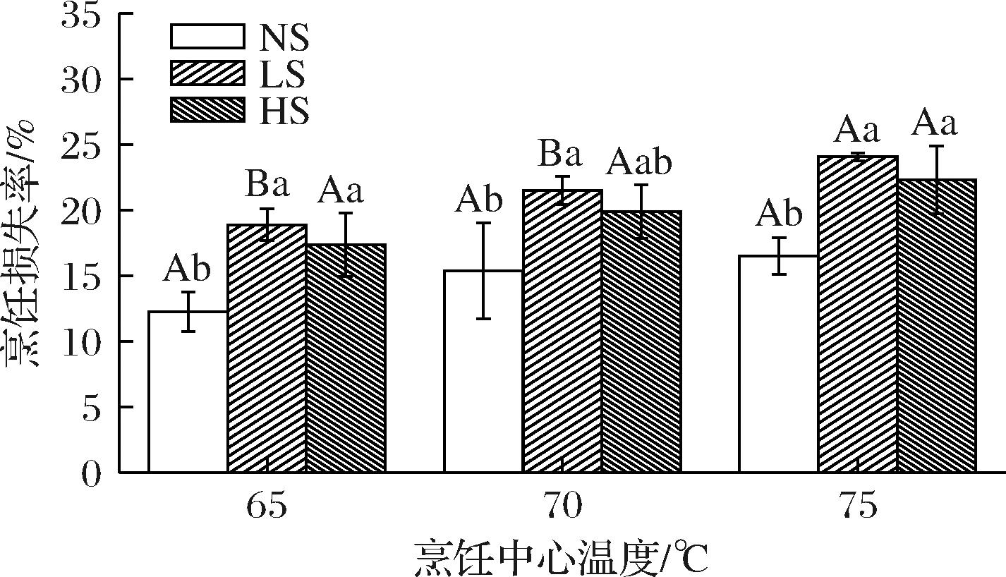 牡蛎含水量高,且通常以其活体状态烹饪,其在热加工中易出现应激性的汁液流失[12]。蒸汽辅助烘烤牡蛎的烹饪损失率如图2所示。牡蛎的烹饪损失率随烹饪中心温度提高呈不显著的增大趋势(P>0.05),仅LS-75 ℃烹饪损失率显著大于LS-65 ℃与LS-70 ℃(P<0.05);除HS-70 ℃外,蒸汽辅助烘烤均使牡蛎烹饪损失率显著增加(P<0.05),这可能由于蒸汽阻碍牡蛎烘烤过程中表面结壳,从而无法阻止其水分溢出[13]。