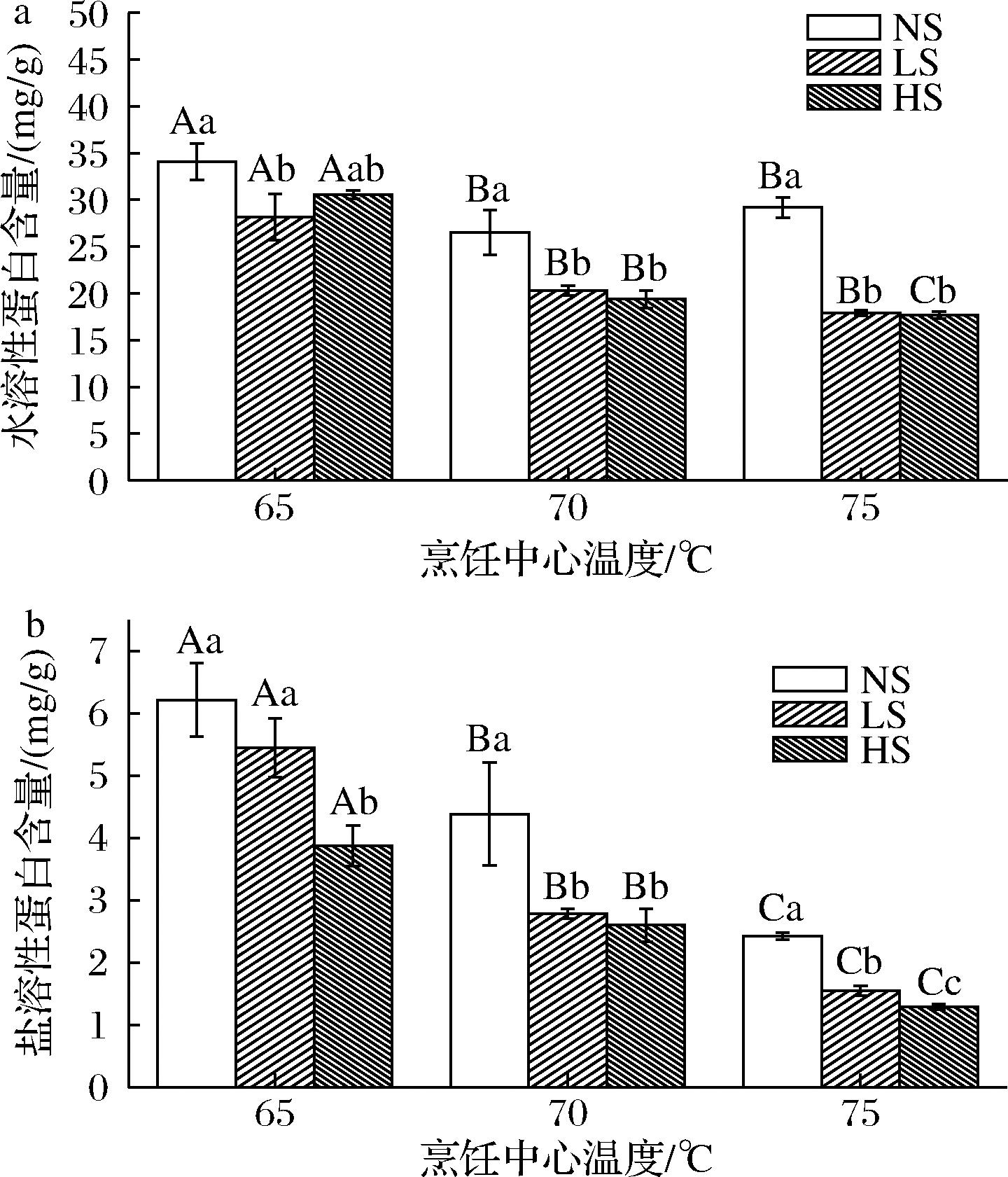 可溶性蛋白含量对肉类、水产品蛋白的持水力有潜在影响,可作为其熟制程度的指标[14]。如图3所示,牡蛎水溶性蛋白、盐溶性蛋白含量随烹饪中心温度的升高分别呈先下降后稳定与持续下降的趋势;进一步达到75 ℃时,水溶性蛋白含量则无显著变化。蒸汽辅助烘烤在各个烹饪中心温度的水溶性与盐溶性蛋白含量均较对照低15%~40%,其中HS组牡蛎仅盐溶性蛋白在烹饪中心温度达到65、75 ℃时显著小于LS组(P<0.05)。以上结果表明蒸汽能够促进牡蛎烹饪过程中蛋白质含量下降,推测蒸汽可能具有促进蛋白质变性的作用。