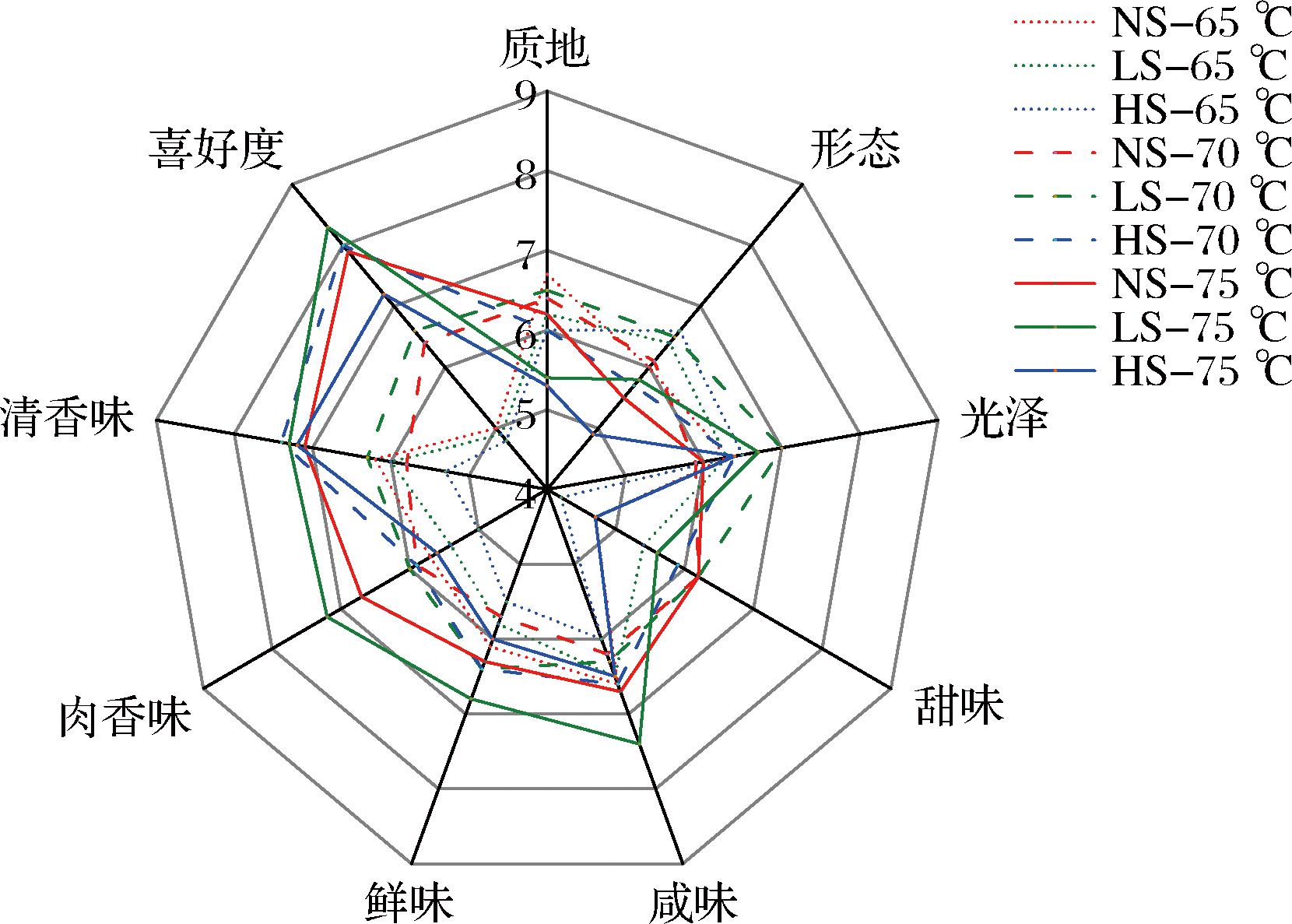 蒸汽辅助烘烤方式对牡蛎感官评分如图1所示。LS-75 ℃、HS-70 ℃与NS-75 ℃具有较高的喜好度评分,其中LS-75 ℃在鲜味、咸味、肉香味3项指标评分较高,而HS-70 ℃在清香味这一指标评分最高。烹饪中心温度升高使牡蛎肉香味与喜好度评分较高,可能与烹饪过程中牡蛎的风味变化有关;蒸汽量增大使牡蛎形态、光泽评分提升,可能由于湿热环境不利于牡蛎产生结壳;烹饪中心温度升高以及蒸汽量增大使牡蛎质地、形态得分降低,可能与烹饪造成的汁液流失有关。