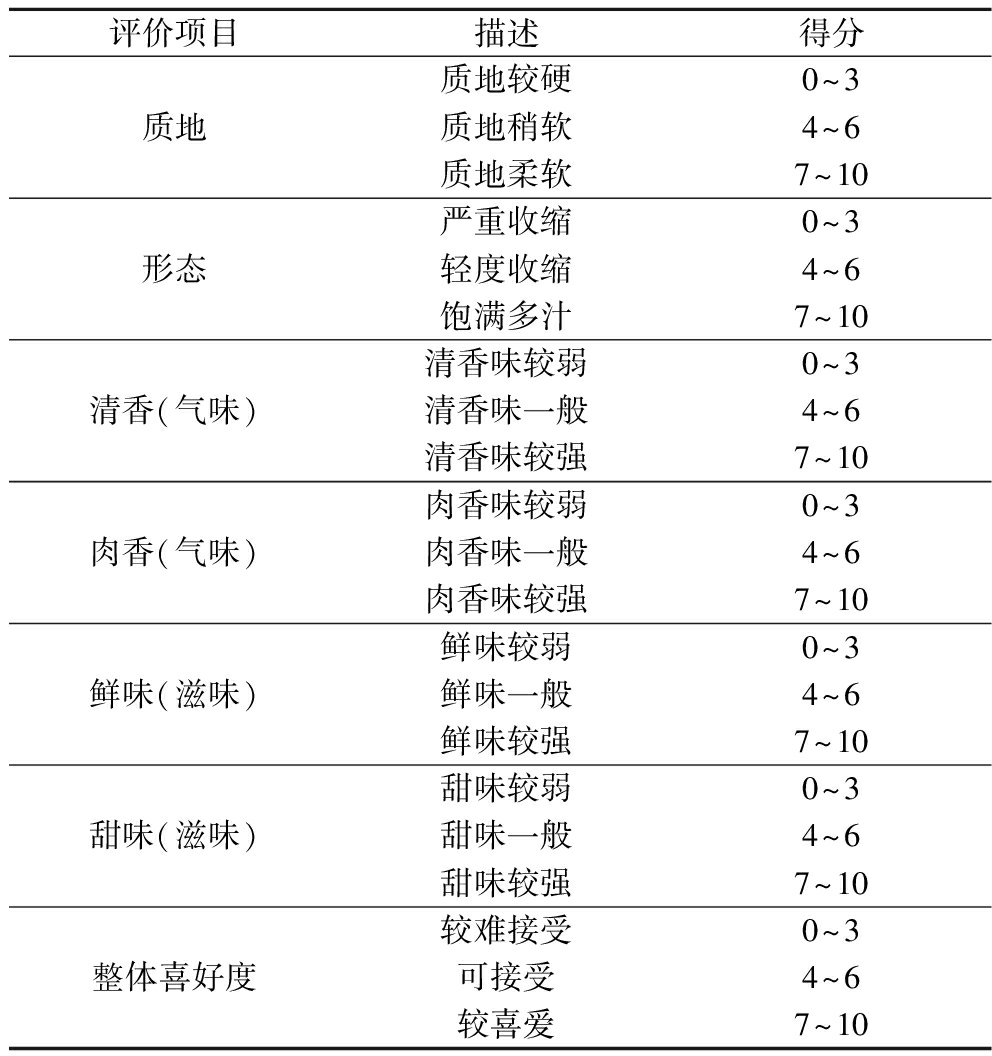 评价项目描述得分质地质地较硬0~3质地稍软4~6质地柔软7~10形态严重收缩0~3轻度收缩4~6饱满多汁7~10清香(气味)清香味较弱0~3清香味一般4~6清香味较强7~10肉香(气味)肉香味较弱0~3肉香味一般4~6肉香味较强7~10鲜味(滋味)鲜味较弱0~3鲜味一般4~6鲜味较强7~10甜味(滋味)甜味较弱0~3甜味一般4~6甜味较强7~10整体喜好度较难接受0~3可接受4~6较喜爱7~10