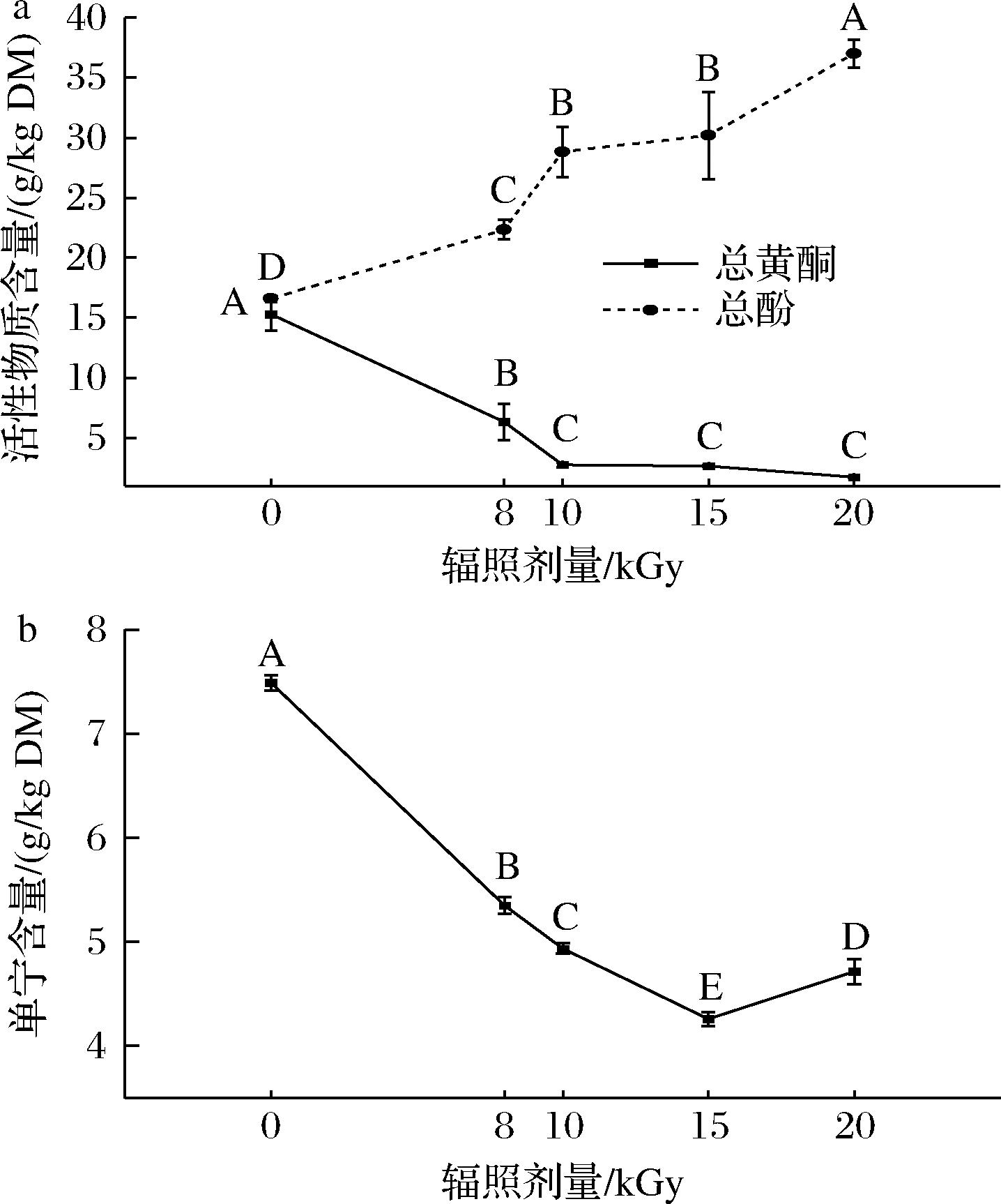 未辐照组构叶总酚含量为16.29 g/kg DM,随辐照剂量增加显著上升至20 kGy时的36.99 g/kg DM。该现象提示辐照促进酚类物质积累可能有两方面因素:一方面,EBI激活苯丙烷代谢通路关键酶(如苯丙氨酸解氨酶)促进酚类前体合成[30];另一方面,辐照诱导的膜脂过氧化可破坏细胞膜通透性,促进结合态酚类物质的溶出[31]。