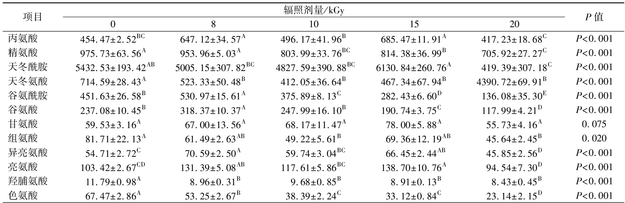 项目辐照剂量/kGy08101520P值丙氨酸454.47±2.52BC647.12±34.57A496.17±41.96B685.47±11.91A417.23±18.68CP<0.001精氨酸975.73±63.56A953.96±5.03A803.99±33.76BC814.38±36.99B705.92±27.27CP<0.001天冬酰胺5432.53±193.42AB5005.15±307.82BC4827.59±390.88BC6130.84±260.76A419.39±307.18CP<0.001天冬氨酸714.59±28.43A523.33±50.48B412.05±36.64B467.34±67.94B4390.72±69.91BP<0.001谷氨酰胺451.63±26.58B530.97±15.61A375.89±8.13C282.43±6.60D136.08±35.30EP<0.001谷氨酸237.08±10.45B318.37±10.37A247.99±16.10B190.74±3.75C117.99±4.21DP<0.001甘氨酸59.53±3.16A67.00±13.56A68.17±11.47A78.00±5.88A55.73±4.16A0.075组氨酸81.71±22.13A61.49±2.63AB49.22±5.61B69.36±12.19AB45.64±2.45B0.020异亮氨酸54.71±2.72C70.59±2.50A59.74±3.04BC66.45±2.44AB45.85±2.56DP<0.001亮氨酸103.42±2.67CD131.39±5.08AB117.61±5.86BC138.70±10.76A94.54±7.30DP<0.001羟脯氨酸11.79±0.98A8.96±0.31B9.68±0.85B8.91±0.13B8.43±0.45BP<0.001色氨酸67.47±2.86A53.25±2.67B38.39±2.24C33.12±0.84C23.14±2.15DP<0.001
