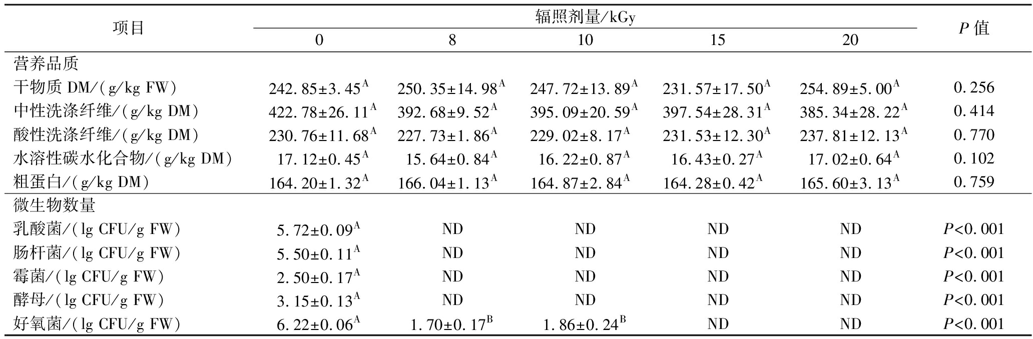 项目辐照剂量/kGy08101520P值营养品质干物质DM/(g/kg FW)242.85±3.45A250.35±14.98A247.72±13.89A231.57±17.50A254.89±5.00A0.256中性洗涤纤维/(g/kg DM)422.78±26.11A392.68±9.52A395.09±20.59A397.54±28.31A385.34±28.22A0.414酸性洗涤纤维/(g/kg DM)230.76±11.68A227.73±1.86A229.02±8.17A231.53±12.30A237.81±12.13A0.770水溶性碳水化合物/(g/kg DM)17.12±0.45A15.64±0.84A16.22±0.87A16.43±0.27A17.02±0.64A0.102粗蛋白/(g/kg DM)164.20±1.32A166.04±1.13A164.87±2.84A164.28±0.42A165.60±3.13A0.759微生物数量乳酸菌/(lg CFU/g FW)5.72±0.09ANDNDNDNDP<0.001肠杆菌/(lg CFU/g FW)5.50±0.11ANDNDNDNDP<0.001霉菌/(lg CFU/g FW)2.50±0.17ANDNDNDNDP<0.001酵母/(lg CFU/g FW)3.15±0.13ANDNDNDNDP<0.001好氧菌/(lg CFU/g FW)6.22±0.06A1.70±0.17B1.86±0.24BNDNDP<0.001