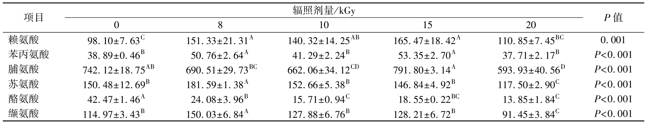 项目辐照剂量/kGy08101520P值赖氨酸98.10±7.63C151.33±21.31A140.32±14.25AB165.47±18.42A110.85±7.45BC0.001苯丙氨酸38.89±0.46B50.76±2.64A41.29±2.24B53.35±2.70A37.71±2.17BP<0.001脯氨酸742.12±18.75AB690.51±29.73BC662.06±34.12CD791.80±3.14A593.93±40.56DP<0.001苏氨酸150.48±12.69B181.59±1.38A152.66±5.38B146.84±4.92B117.50±2.90CP<0.001酪氨酸42.47±1.46A24.08±3.96B15.71±0.94C18.55±0.22BC13.85±1.84CP<0.001缬氨酸114.97±3.43B150.03±6.84A127.88±6.76B128.21±6.72B91.45±3.84CP<0.001