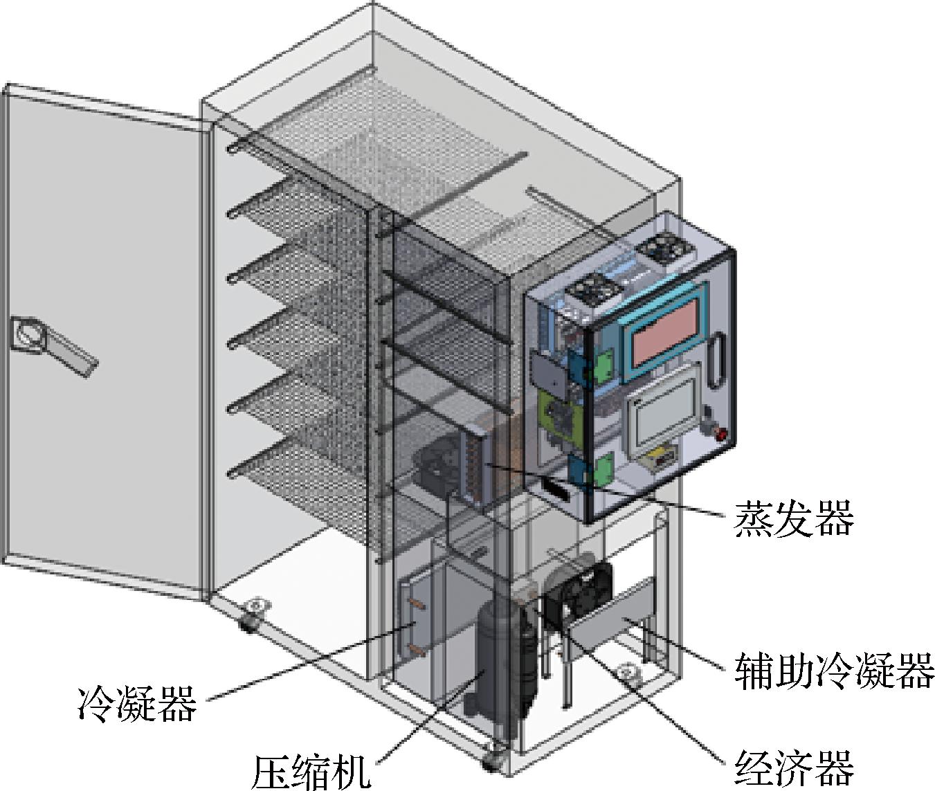本试验所设计的准双级变频热泵干燥系统的原理图见图1,实验装置的三维图及实物图如图2所示。该实验台主要由3个部分组成,分别是热泵系统、干燥介质系统和数据采集及控制系统。其中,热泵系统属于干燥实验装置的核心组成部分,主要组成包括压缩机、膨胀阀、经济器、蒸发器和冷凝器。采用海立WHP系列变频压缩机(转速调节范围:900~7 200 r/min),R134a作为制冷剂工质。热泵的工作原理基于制冷剂的循环流动,通过调整制冷剂的状态以实现热量的吸收和释放。在热泵系统中,制冷剂被压缩机压缩,转变为高温高压气体并进入冷凝器。在冷凝器中,通过与干燥介质的热交换,制冷剂被冷却凝结成高温液体。随后,制冷剂流向辅助冷凝器,将系统中多余的热量排出。接着,制冷剂被分成2个部分,一部分流经经济器进一步放热,随后通过节流阀流至蒸发器,在蒸发器中与干燥介质进行热交换,转化成低温低压的气态,最终流回到压缩机,完成一个循环。另一部分的制冷剂通过辅助节流阀节流后在经济器中蒸发吸热,转变为中温中压的制冷剂气体,然后进入压缩机补气口进行再次压缩。对于干燥介质系统,其主要部件包括干燥室、循环风机和物料托盘等。在该系统中,空气作为干燥介质。在循环风机作用下空气首先在冷凝器处进行热交换,转化为高温干燥的空气,然后进入干燥室与新鲜物料接触,将水分吸收到空气中。随后,循环风机将含水的干燥介质传送至蒸发器处,通过制冷剂蒸发吸热作用实现湿空气的降温除湿,水分以冷凝形式析出。之后干燥介质再次回到冷凝器处受热升温吸收物料中的水分,形成一个完整循环。通过利用热泵系统的能效优势以及冷热换热器同时发挥作用,实现了对湿物体的高效干燥,提高了整个系统的性能和能源利用效率。